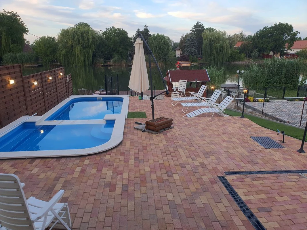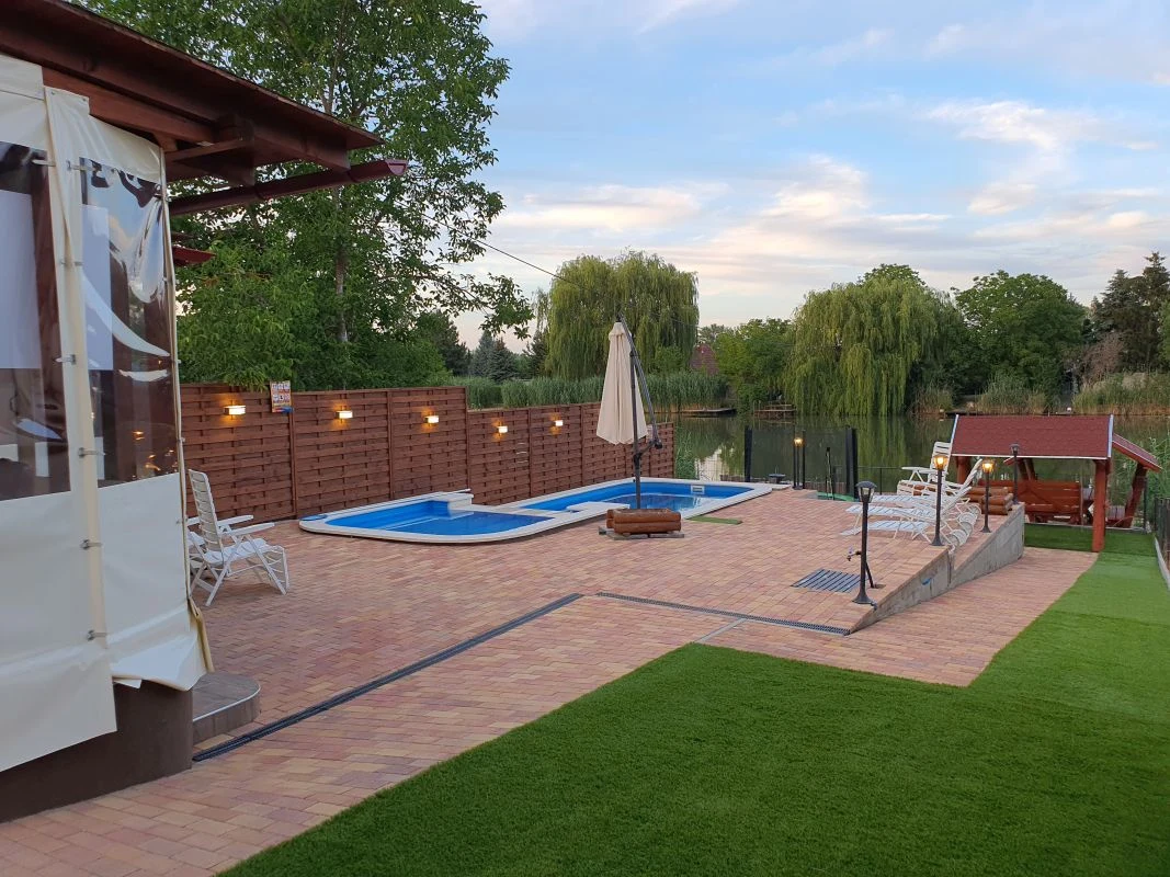 Az épülethez tartozik egy hangulatos terasz, melyen a 10 személyes kerti faasztal mellett egy 8 személyes jacuzzi és a felette elhelyezett nagyméretű TV gondoskodik a kellemes kikapcsolódásról. A terasz ponyvával téliesített.A négy oldalról (vízpart felől is) zárt udvarban kiépített járdák vezetnek a térkövezett medencerészhez, ahol egy 2,5 x 3 m-es, és egy 6 x 3 méteres, szezonálisan fűthető medence található napozóágyakkal és hintaággyal. A felhőtlen szórakozást a nagyobbaknak pingpong- és csocsóasztal, a kisebbeknek trambulin, hinta, csúszda és mászóka garantálja. A kert zöldjéről műfű gondoskodik, melynek köszönhetően az udvar télen-nyáron egyforma szépségben pompázik.