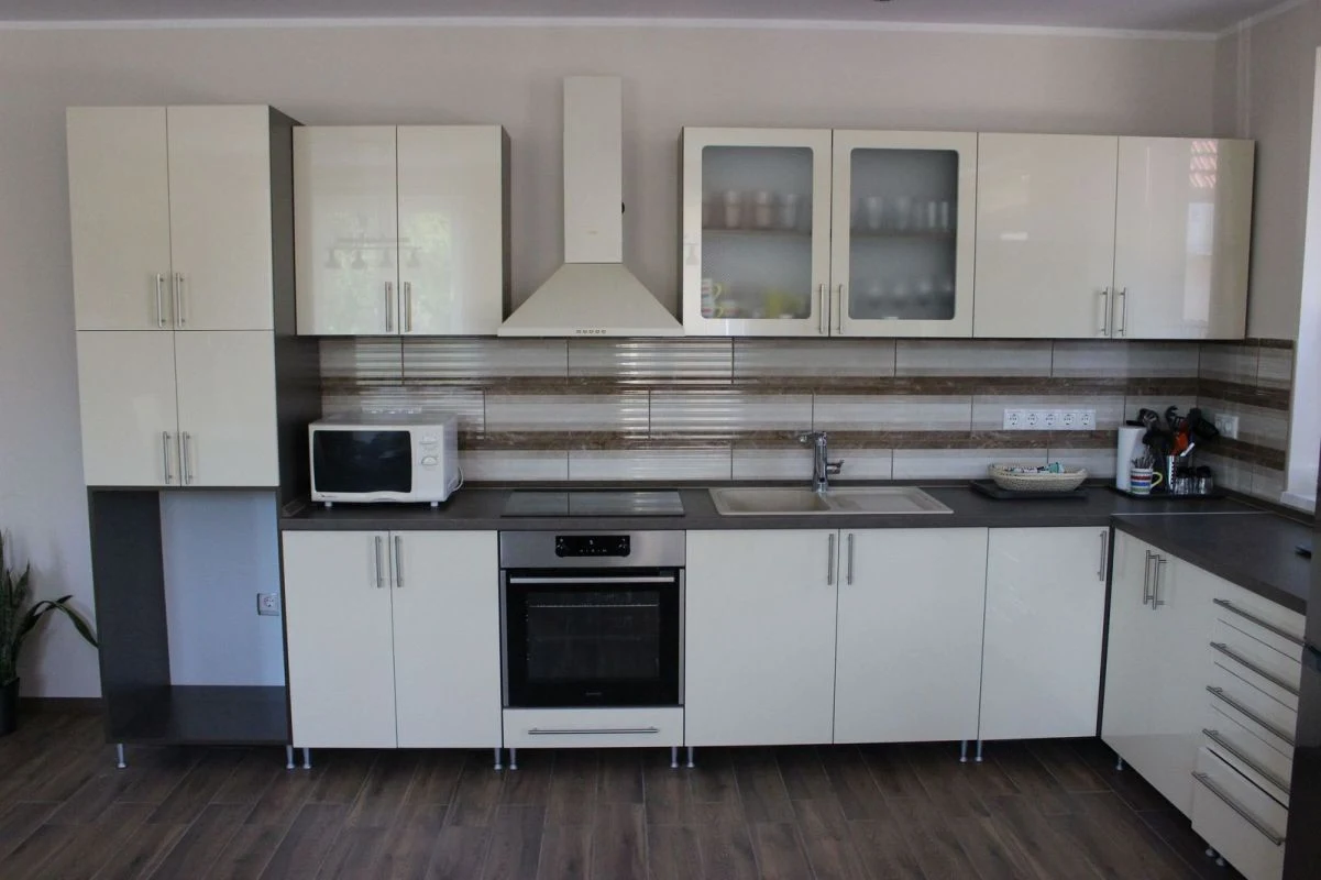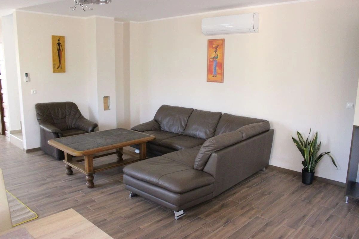 A 4 hálószobás, 3 fürdőszobás nyaraló 12 személy kényelmes elszállásolására valamint további 2 fő pótágyon történő elhelyezésére nyújt lehetőséget.A klimatizált földszinten található egy teljesen felszerelt, modern konyha 12 fős étkezőasztallal. A konyha minden szükséges eszközzel felszerelt: 2 db kombi hűtő, mikrohullámú sütő, kávéfőző, vízmelegítő, elektromos kerámialapos főzőlap és elektromos sütő, edények, poharak, tálak és 14 személyes étkészlet is várja a finom falatokra vágyókat. A nappaliban egy kényelmes, nagy sarokülő biztosítja a pihenést televízióval (Direct One műholdas csatornakínálattal). A földszinti hálószoba 2 személyes, nagyméretű franciaággyal és egy 1 személyes ággyal rendelkezik. A szobához tartozik egy különálló, modern kialakítású, teljesen felszerelt, akadálymentesített fürdőszoba kényelmes tusolóval és WC-vel.