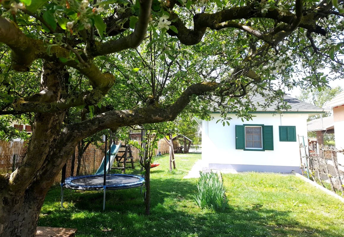 Horgászlak árnyékos, gyermekbarát kerttel