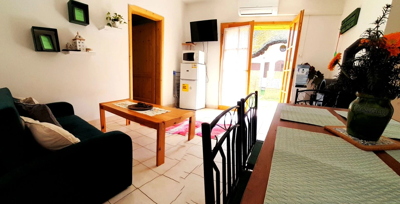 Az egyszintes, 4+2 személyes klimatizált nyaralóba lépve egy légtérben elhelyezkedő nappali és konyha fogadja kedves Vendégeinket. A teljesen felszerelt konyhához (hűtőgép, villanyrezsó, mikrohullámú sütő, kávéfőző, vízforraló, komplett edény-, pohár- és étkészlet 6 főre, borospoharak, baba evőeszközök, baba tálak) egy 6 személyes étkezőasztal is kapcsolódik a nappaliban. Az itt elhelyezett kanapé 2 fő részére pótágyazható, valamint a TV is Vendégeink kikapcsolódását szolgálja. A nappaliból 2 hálószoba nyílik: egy franciaágyas hálószoba, mely játszó- és könyvsarokkal felszerelt, a nappalitól jobbra pedig egy további, két különálló ággyal felszerelt szoba található, melyből a WC-vel, zuhanykabinnal kialakított fürdőszoba nyílik.