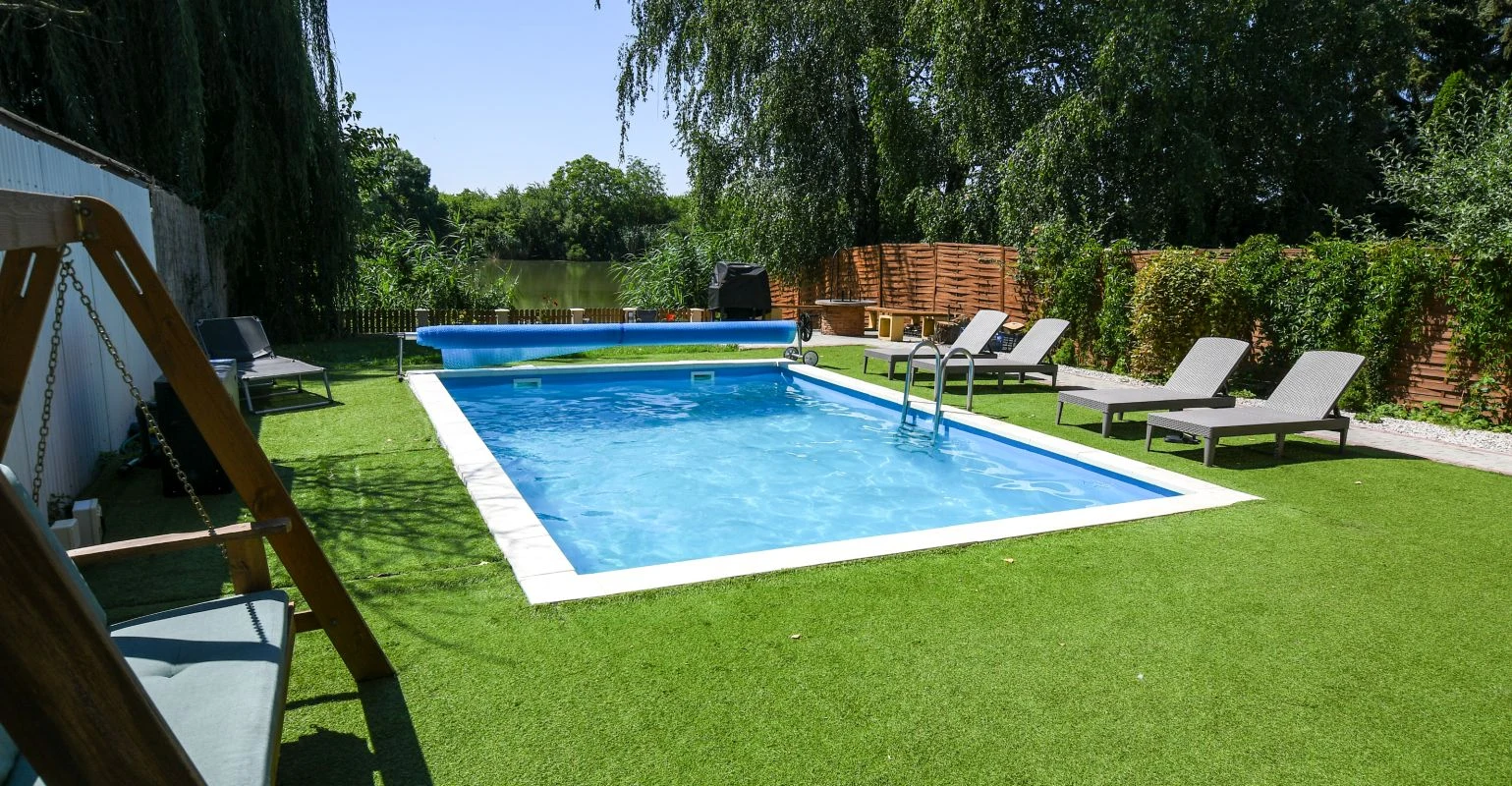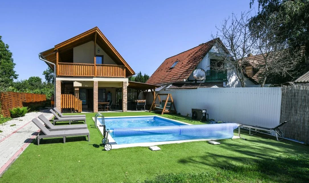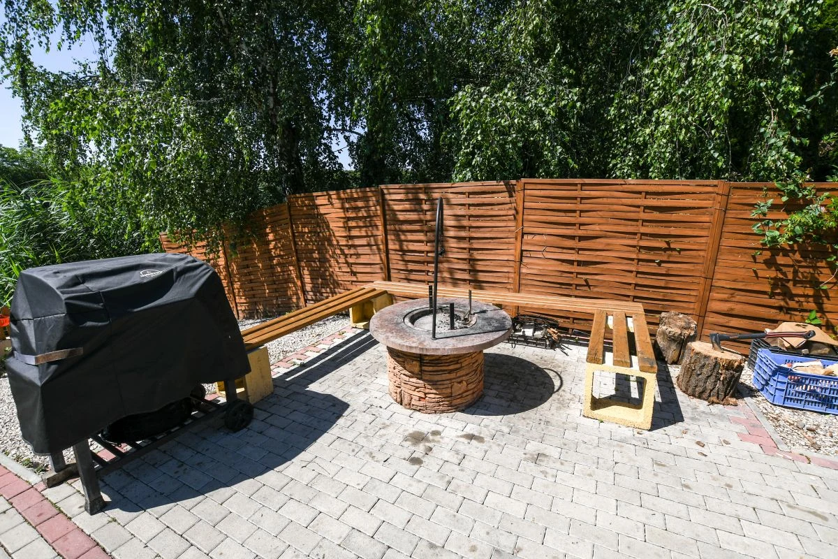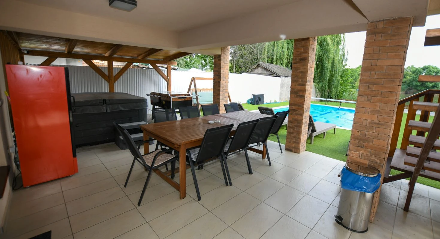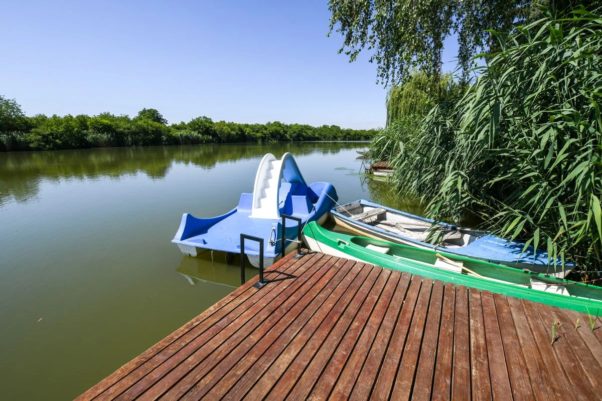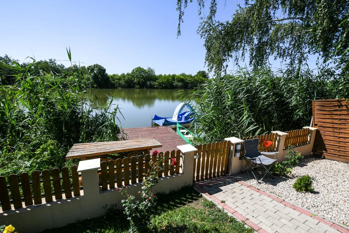 A nappaliból a vízpart felé vezető kijárathoz nagy, fedett terasz kapcsolódik, mely kényelmes kerti bútorokkal felszerelt. A terasz előtt közvetlenül egy 6x4 méteres, 1,5 m mély, hőszivattyúval fűthető, strandszezonban (május végétől szeptember közepéig) üzemelő medence emeli a komfortérzetet, továbbá egy jacuzzi, infraszauna valamint csocsó, darts, pingpongasztal és egy hintaágy is Vendégeink kikapcsolódását szolgálja. A kertben a gyermekeket egy kis házikó várja. A vízparthoz közelebb eső részen helyezkedik el a szalonnasütőhely, melyhez bogrács, faszenes grillfelszerelés és nyársak is rendelkezésre állnak. Minden vendégcsapat részére 20 kg tűzifa biztosított, további tűzifa felár ellenében vásárolható. Emellett kedves Vendégeink a nyaralóhoz tartozó 2 felnőtt kerékpárt is ingyenesen igénybe vehetik.A kiépített, 11,5 méter széles vízparthoz 3x5 méteres stég valamint túrakenu és vízibicikli is tartozik, melyekkel felfedezheti a holtág természeti szépségeit.