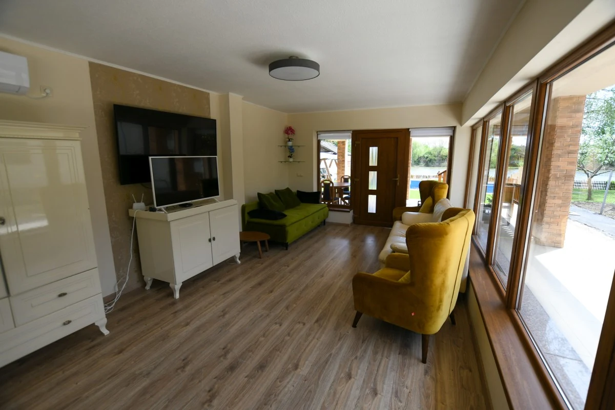 A 10+5 személyes, 4 hálószobás, 4 fürdőszobás klimatizált nyaraló földszintjén hangulatos nappali található, mely 2 fő részére pótágyazható kanapéval és TV-vel gondoskodik Vendégeink kikapcsolódásáról.A nappalival egy légtérben elhelyezkedő, felszerelt amerikai konyhában 15 személyes étkező, illetve minden szükséges eszköz megtalálható (hűtő fagyasztórekesszel, sütő, főzőlap, mosogatógép, mikrohullámú sütő, kapszulás kávéfőző, páraelszívó, 15 fő részére tányér, pohár- és étkészlet, edények).
