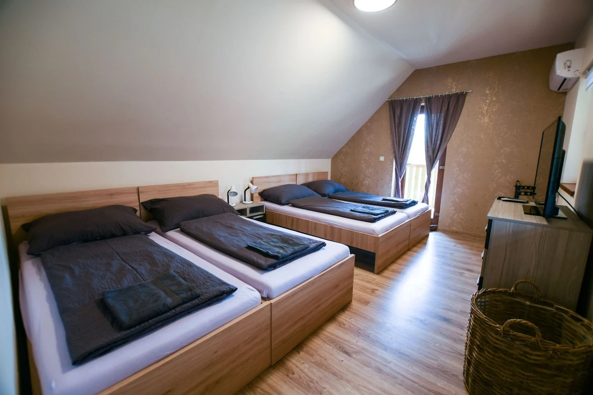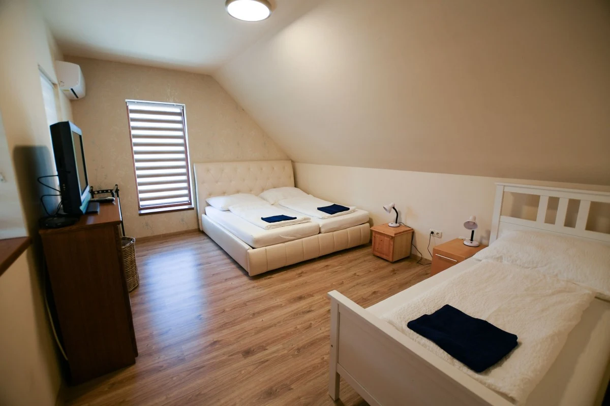 Az első és második hálószobában 4-4 ágy található, a harmadik szobában pedig egy franciaágy és egy egyszemélyes ágy kapott helyet.