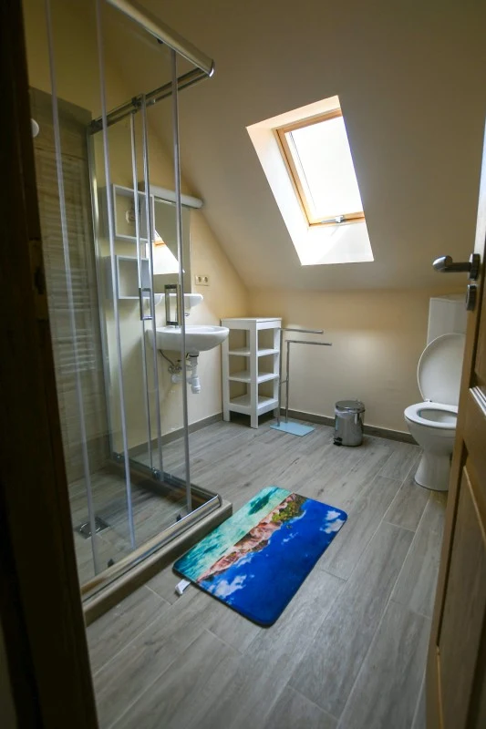 A földszinten kialakításra került továbbá egy franciaággyal felszerelt hálószoba a hozzá tartozó fürdővel és előtérrel, illetve a közösségi térből nyíló, különálló WC is. Mivel a földszinten lépcsők nélkül lehet közlekedni, ezért a nyaraló alsó szintje mozgáskorlátozottak részére is alkalmas.