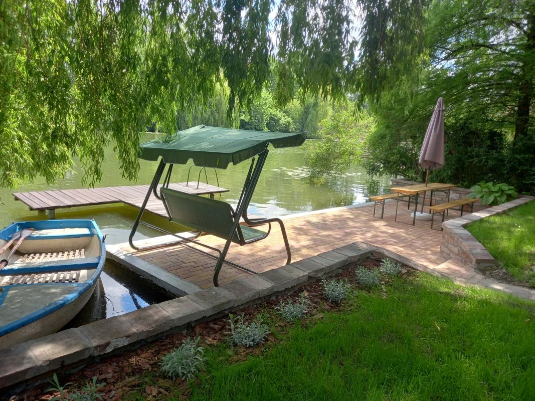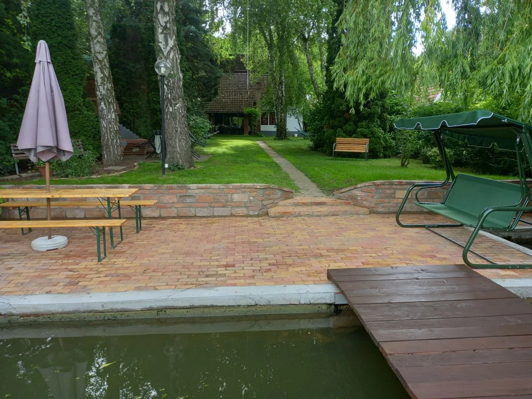 Az üdülő nagy fedett terasza kényelmes kerti bútorokkal áll Vendégeink rendelkezésére. A szomszédos üdülőktől sövénnyel elhatárolt, vízpart felől pedig nyitott nyaraló nagy, parkosított kertjében kiépített szalonnasütő- és bográcsozó hely csalogat sütögetésre. Ehhez bográcsot, nyársakat, grillt, tárcsasütőt valamint az egyszeri sütögetéshez szükséges tűzifát is biztosítjuk. Az örökzöldekkel körülölelt kertben további kerti bútorokból, a vízpartnál pedig hintaágyból gyönyörködhet a kilátásban.A mintegy 20 méteres vízparthoz T-alakú móló kapcsolódik, a csónakkal és 2 db SUP-pal pedig felfedezheti a környék természeti szépségeit.