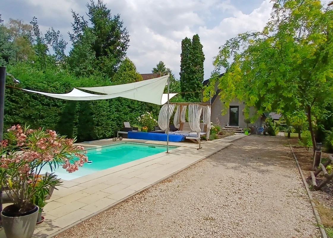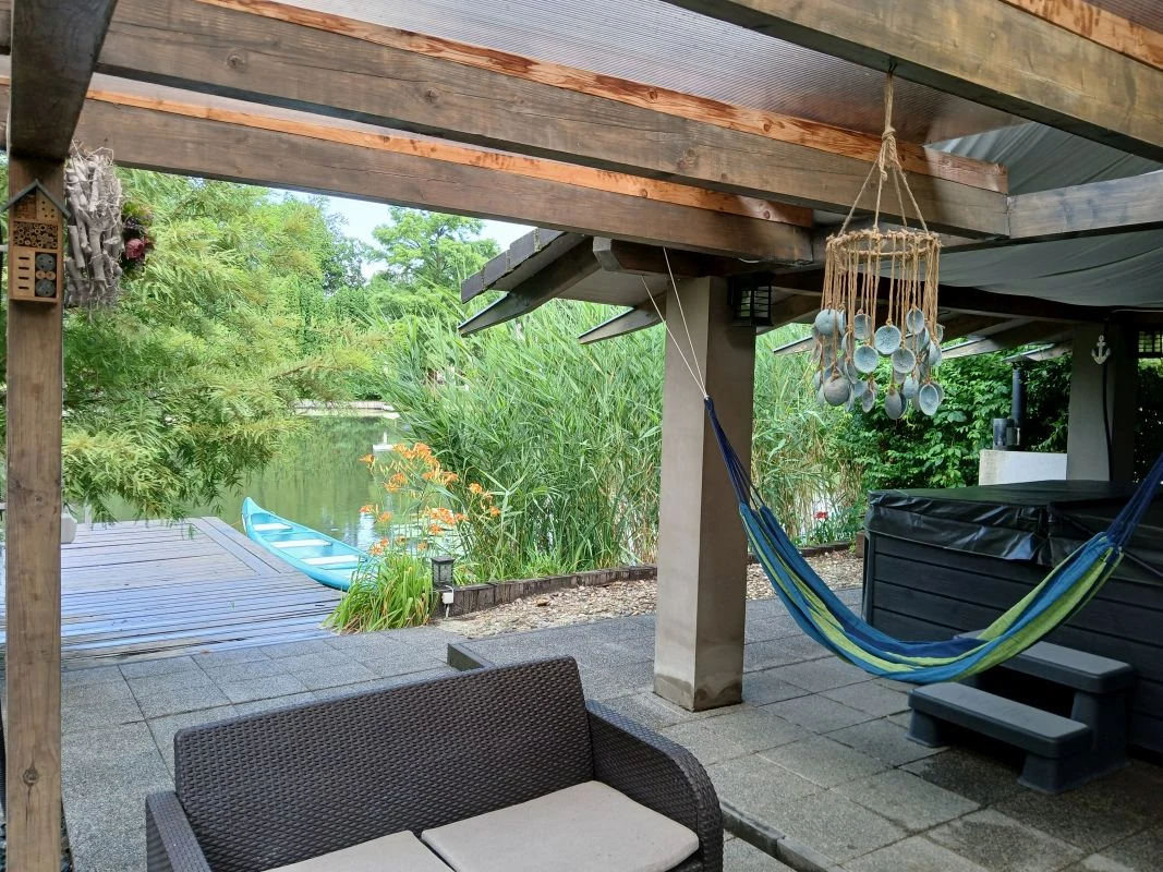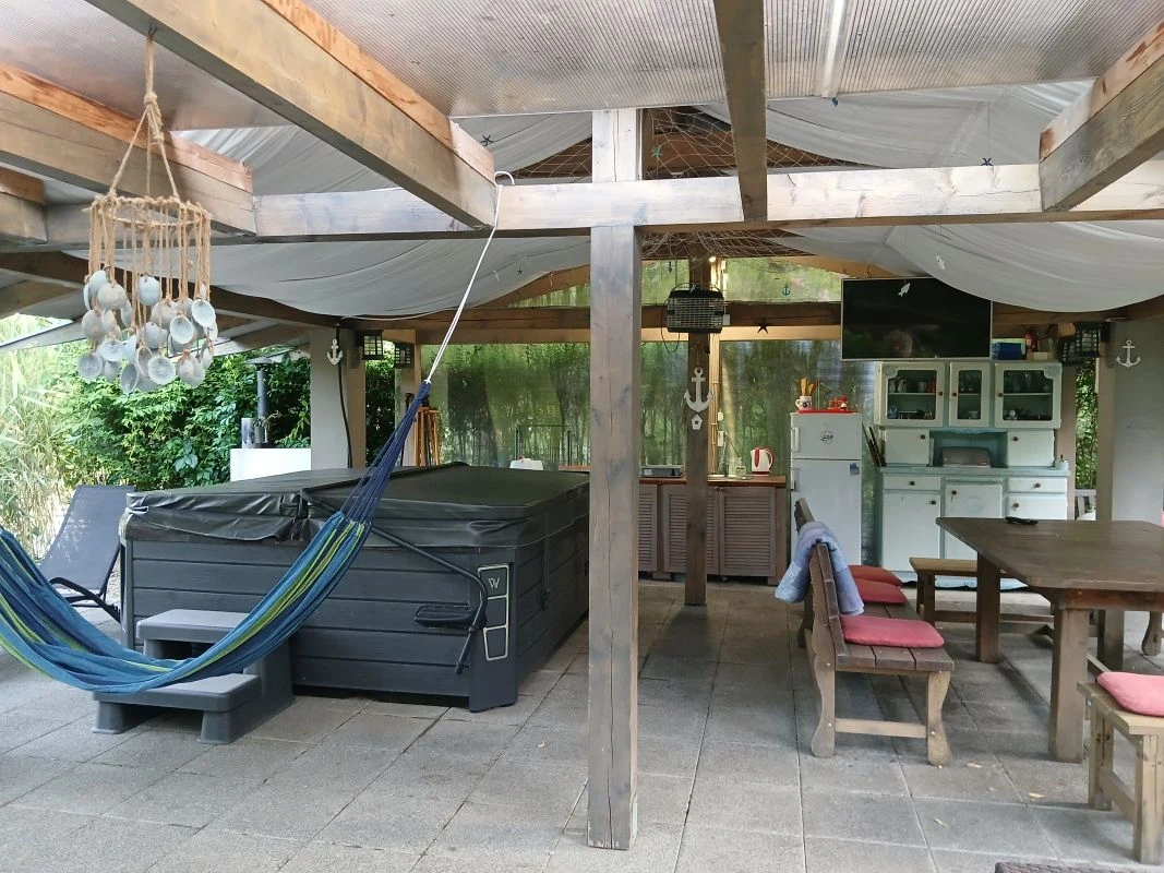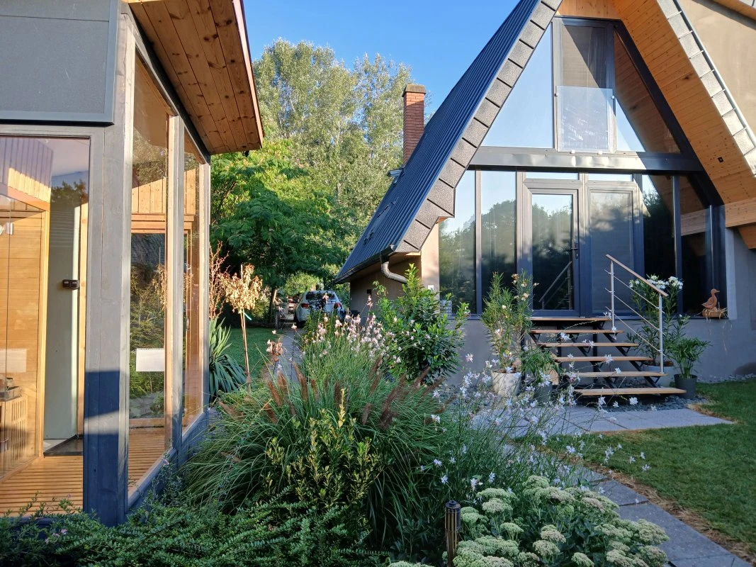 A nyaralóhoz érkezve, az előkertben található 3,5 x 5 méteres, süllyesztett, időszakosan fűtött, napvitorlákkal árnyékolt medence, és mellette baldachinos ágy, egy rattan ülőgarnitúra valamint napozóágyak gondoskodnak a feltöltődésről. Az első bejárat előtt egy dohányzásra kijelölt hely található. A hátsó bejárat előtt hangulatos, fedett teraszon a nyári konyha egy étkező asztallal és TV-vel, valamint kombinált hűtővel, mosogatóval és tűzhellyel teremt hangulatos kültéri főzési és étkezési lehetőséget. A mediterrán hangulatú kertben kültéri sütögető is rendelkezésre áll, melyhez bogrács, grill, tárcsasütő, nyársak és az ehhez szükséges tűzifa is biztosított. Szintén a nyári konyhához tartozik az itt elhelyezett 5 személyes jacuzzi, melyből gyönyörű kilátás nyílik a Holt-Körösre. Emellett a kertben a finn szaunás wellness részleg is kedves Vendégeink kikapcsolódását segíti.A 10 méter széles vízparthoz egy 4 x 6 méteres stég kapcsolódik, melynek teljes szélességében napozásra, horgászatra nyílik lehetőség. A kikapcsolódáshoz a kiépített vízparton egy túrakenu is biztosított, mellyel Vendégeink bebarangolhatják a holtágat.