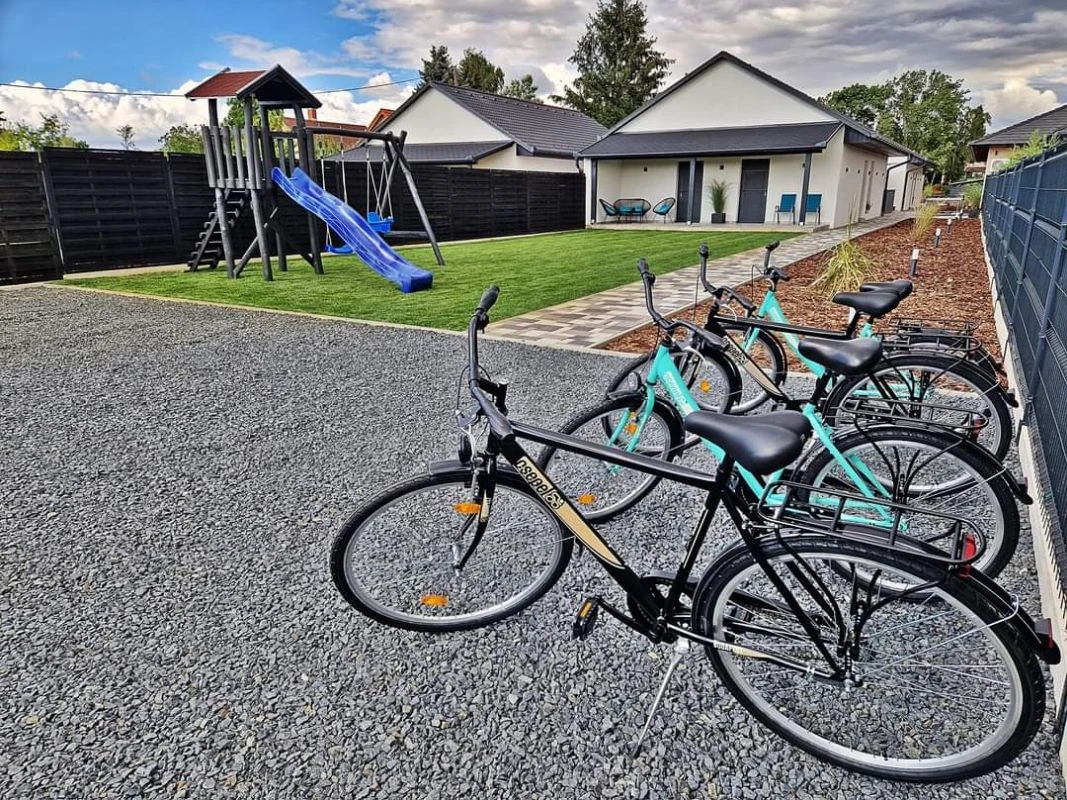 A közösségi térnél, jacuzzinál, medencénél, vízparton, kertben és a házon elhelyezett éjszakai fények különleges hangulatot teremtenek, ezért arra biztatjuk kedves Vendégeinket, hogy azokat bátran használják. Az utca felőli apartmanok előtt kapott helyet egy nagyobb füves terület, ahol a kicsiknek kedvezve egy-egy játszótér került kialakításra csúszdával, hintával, homokozóval illetve lehet focizni, tollasozni, amíg a szülők az apartmanok teraszáról szemmel tudják tartani a gyerekeket. A telkekhez tartozik továbbá 4-4 db kerékpár (4 férfi illetve 4 női), amivel bebarangolhatják a kerékpárbarát Békésszentandrást és Szarvast!