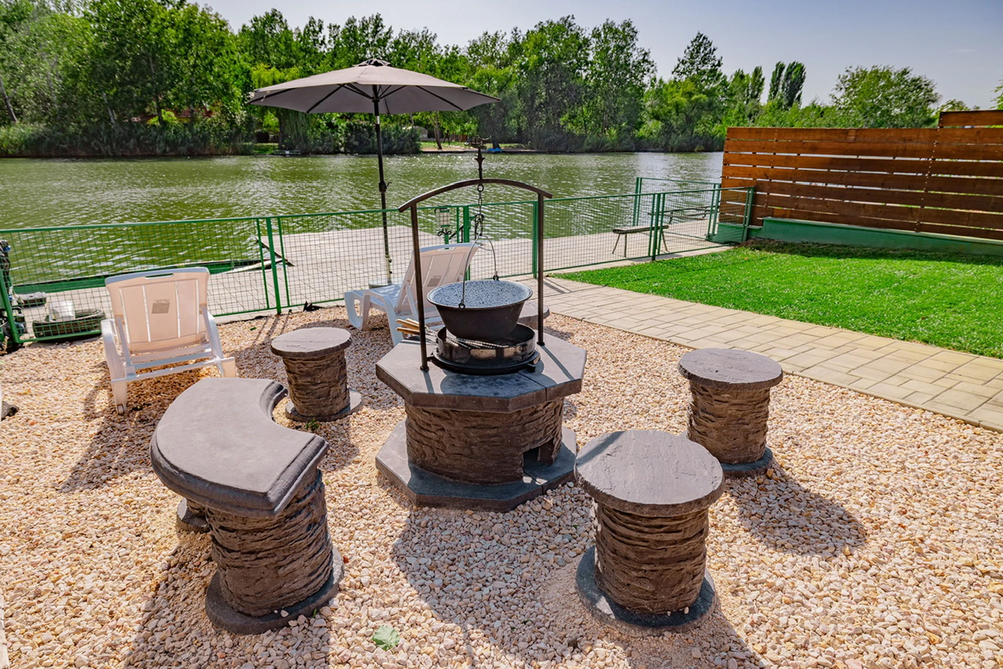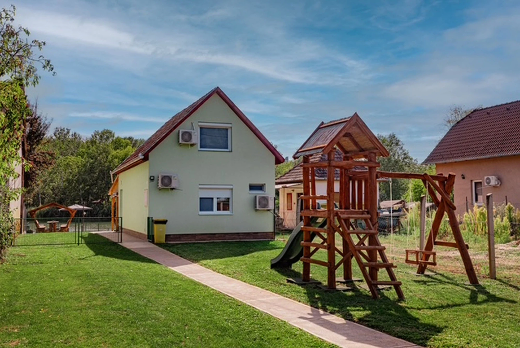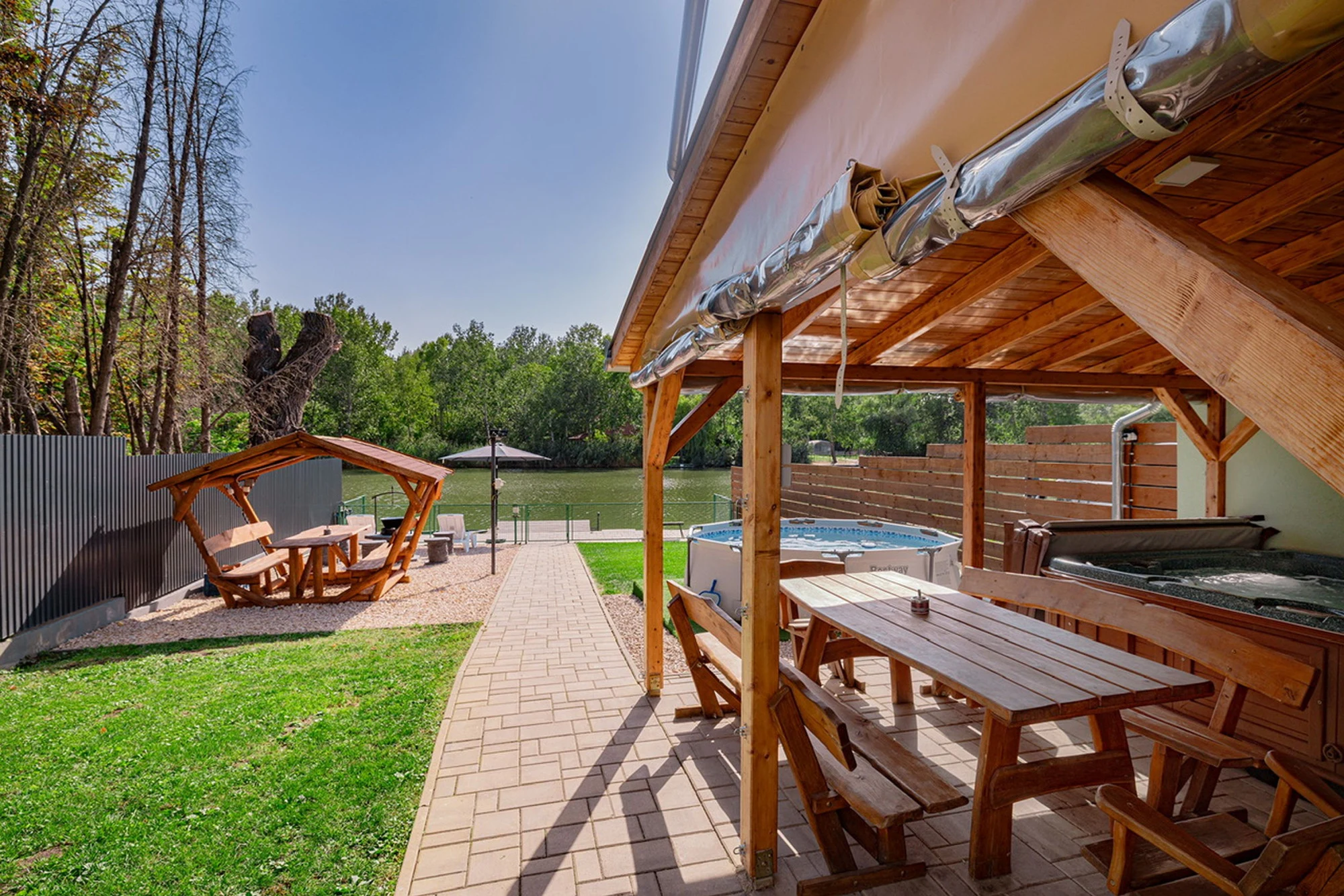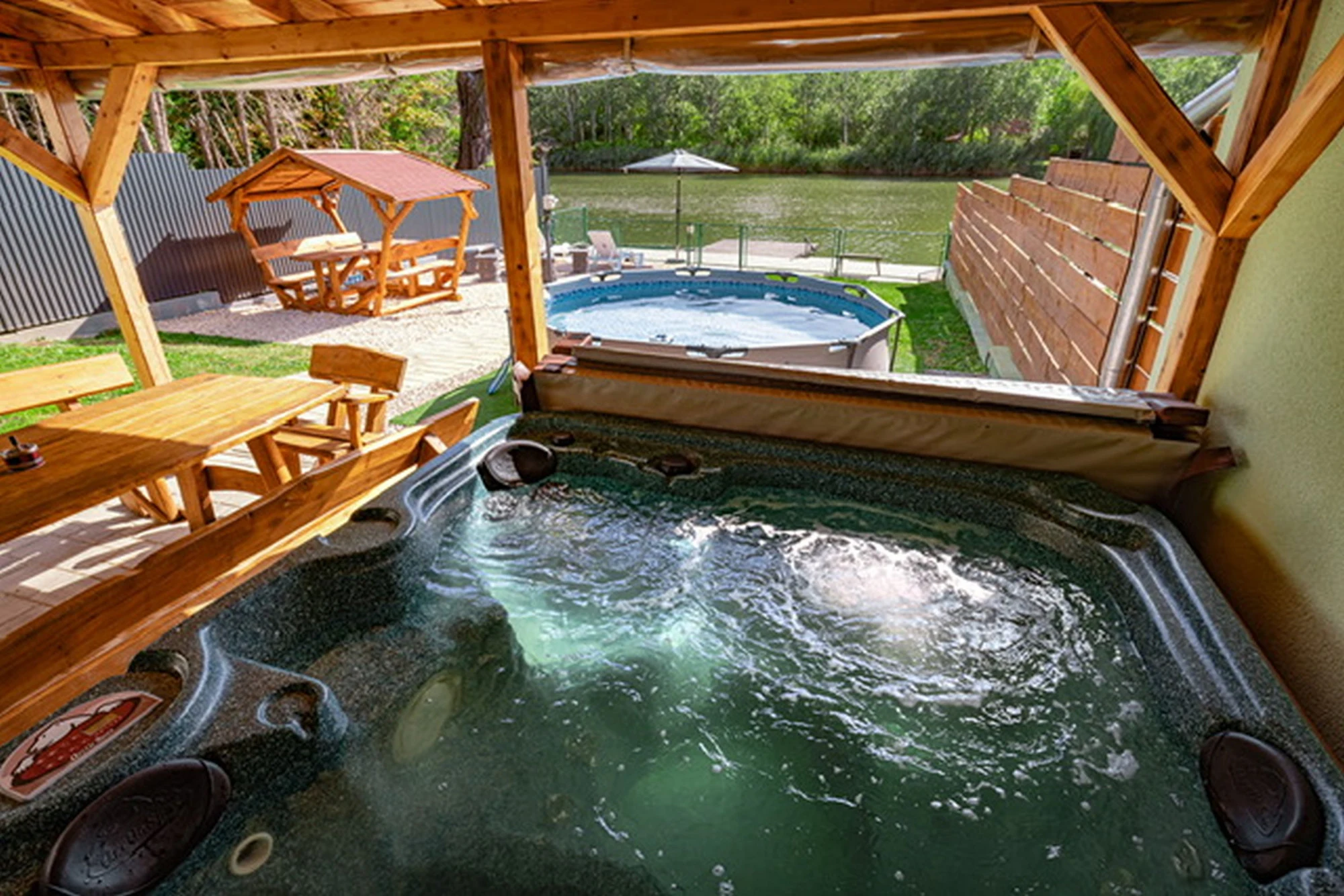 Az épületből kilépve egy ponyvával téliesíthető teraszra érkezünk, ahol a 4 személyes jacuzzi mellett egy asztal is található, mely a közös étkezések kiváló színtere lehet. A terasz szomszédságában egy 3 méter átmérőjű, merev falú medence is helyet kapott, amely nyáron tökéletes felfrissülést nyújt. A kertben egy további kerti kiülőről vagy a napágyakon pihenve is gyönyörködhetünk holtágban, ahová térkövezett járda vezet a terasztól. A kerti bográcsozáshoz bogrács, grill és nyársak, valamint az ezekhez szükséges tűzifa is biztosított.A gyermekek részére egy hintával és csúszdával felszerelt rönkfa játszótér gondoskodik az önfeledt kikapcsolódásról.