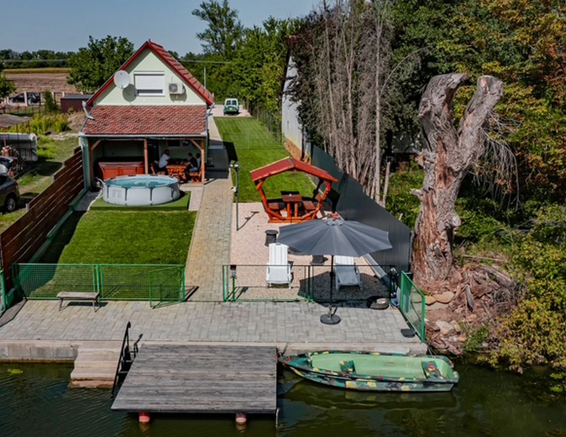 A kiépített, 12 méter széles vízparton egy 3 × 3 méteres stég áll Vendégeink rendelkezésére. A nyaralóhoz tartozó csónakkal felfedezhetőek a környék természeti szépségei. A négy oldalról (vízpart felől is) zárt nyaraló nagy udvarában 5-6 gépkocsi részére parkolási lehetőség nyílik.