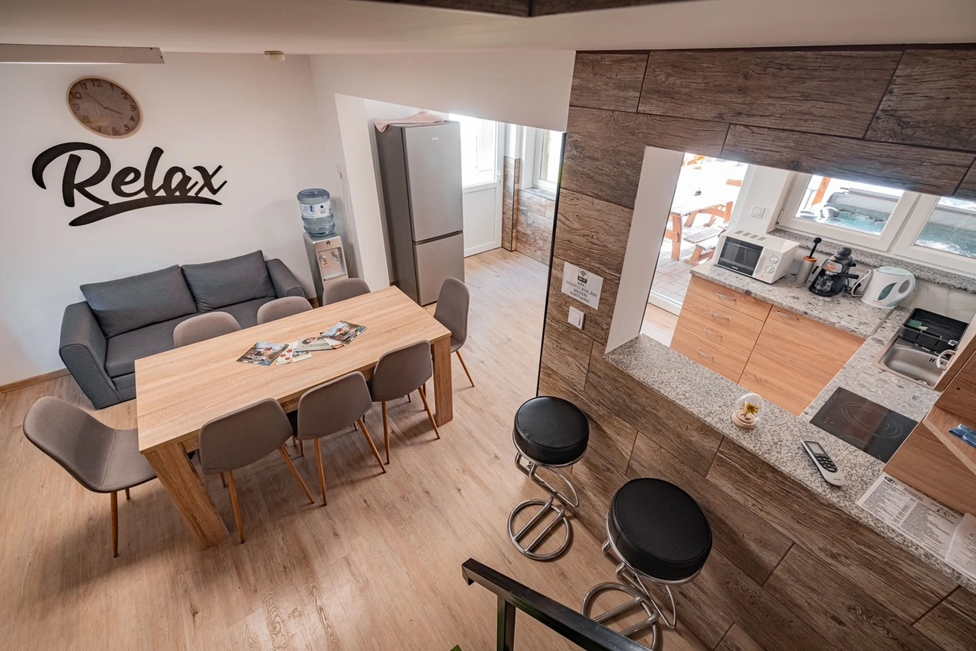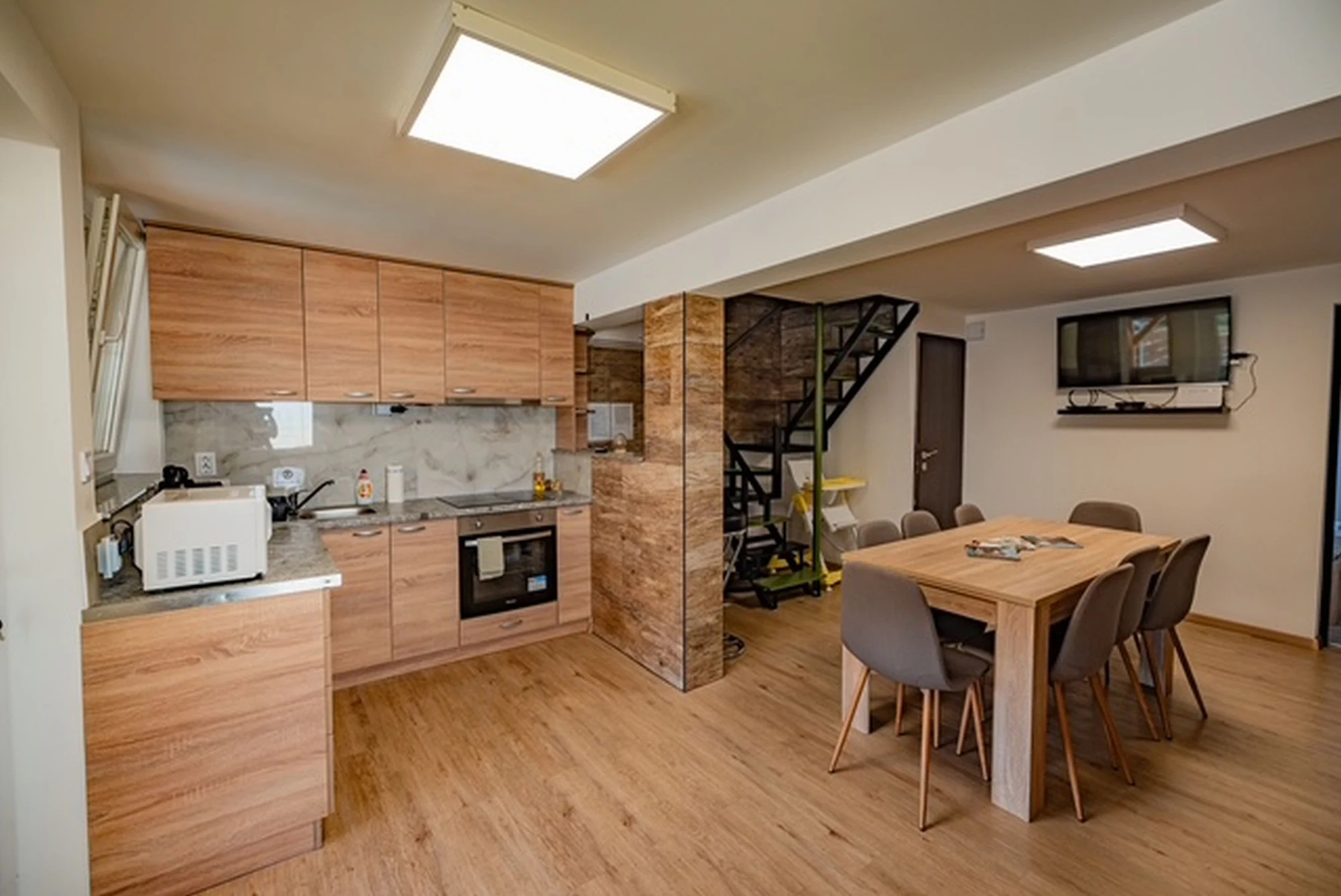 A modern stílusban kialakított, kétszintes, légkondicionált nyaraló földszintjén egy tágas, amerikai konyhás nappali fogadja az ide érkező Vendégeket. A nappalival egy légtérben található az étkező, ahol egy nagy étkezőasztal és egy TV is helyet kapott a kényelmes étkezések és közös időtöltés érdekében.A konyha teljeskörűen felszerelt: kombinált hűtőszekrény, főzőlap, sütő, mikrohullámú sütő, kávéfőző, vízforraló, edények, valamint evőeszközkészlet 6 fő részére is rendelkezésre áll.