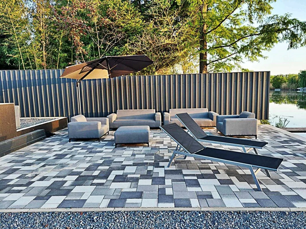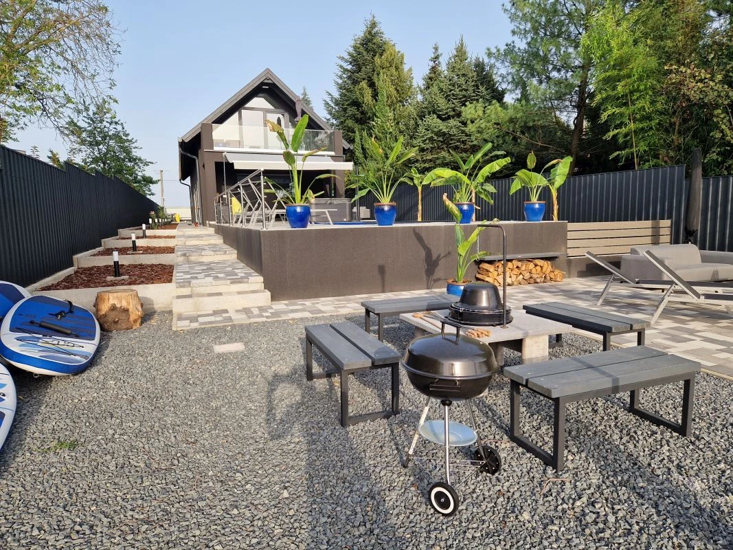 A nyaralót a földszinten szintén két terasz veszi körbe. Az utcafront felőli teraszon egy kiülő található asztallal. A vízpart felől, a nappaliból kilépve egy nagyobb, fedett, hidegebb időben körbeponyvázott teraszra érkezünk, ahol egy 8 személyes asztal és egy kényelmes rattan napozóágy teremt kényelmet. Itt kapott helyet az 5 személyes jacuzzi és a 6 személyes, kombinált infra- és finn szauna is. A wellness részleg további részét képezi a nagyméretű, 3,5 méter széles, 9 méter hosszú és 1,40 méter mély, áprilistól októberig fűthető, banánfákkal körbeölelt medence is.A kert vízpart felőli részén szinteltolással található egy nagy kerti kiülő napernyővel. Mellette sütögető került kiépítésre, melyhez szalonnasütőrács, bogrács, nyárs és grill valamint az ezekhez szükséges tűzifa is biztosított.
