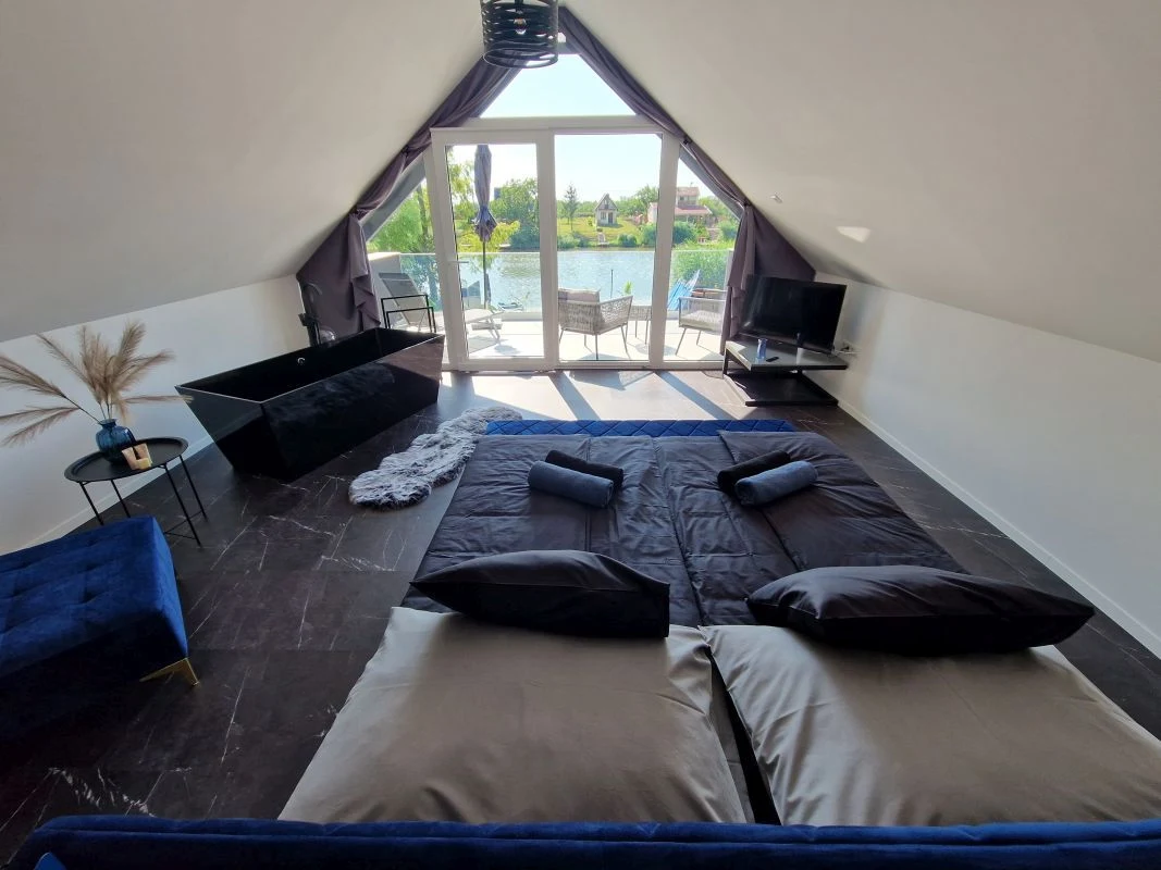 A minden igényt kielégítően felszerelt, téliesített és klimatizált, 10+2 fős vízparti nyaraló 5 hálószobával és 4,5 fürdőszobával rendelkezik. Földszintjén a folyosón haladva egy teljesen felszerelt konyhás nappali fogadja Vendégeinket. A TV-vel rendelkező, modern kialakítású nappaliban elhelyezett kanapé két fő kényelmes fekvőhelyévé alakítható. A teljeskörűen felszerelt konyhában egy nagy méretű beépített hűtőszekrény, 3 rekeszes fagyasztószekrény, főzőlap, beépített sütő, mikrohullámú sütő, kenyérpirító, vízforraló valamint egy Dolce Gusto kapszulás kávéfőző is biztosított a 12 személyes edény-, pohár- valamint étkészlet mellett. A folyosóról nyílik mind a 3 földszinten található hálószoba. A szobák mindegyikében 1-1 db 180x200 cm-es franciaágy gondoskodik a pihentető kikapcsolódásról. Az egyik hálószobából saját, WC-vel felszerelt zuhanyzós fürdőszoba nyílik, míg a másik két hálószobához közös, fürdőkádas fürdőszoba és egy WC tartozik. A folyosón helyet kapott még egy plusz WC is.Az emeleten további 2 db franciaágyas, saját fürdőszobával és WC-vel rendelkező hálószoba került kialakításra. Mindkét hálószoba teraszkapcsolattal rendelkezik. Az egyik szoba az utcafront felé néz, nagyméretű teraszos kiülővel. A másik, nagyméretű szoba szintén teraszos kiülővel rendelkezik és a Holt-Körösre nyújt panorámát. Ennek a helyiségnek központi elemét képezi a fekete fürdőkád, így fürdőzés közben is gyönyörködhetünk a vízpart nyújtotta látványban. A két szoba között, a lépcsőfordulóban kialakítottunk egy kisebb, kávéfőzővel felszerelt közösségi társalgót.
