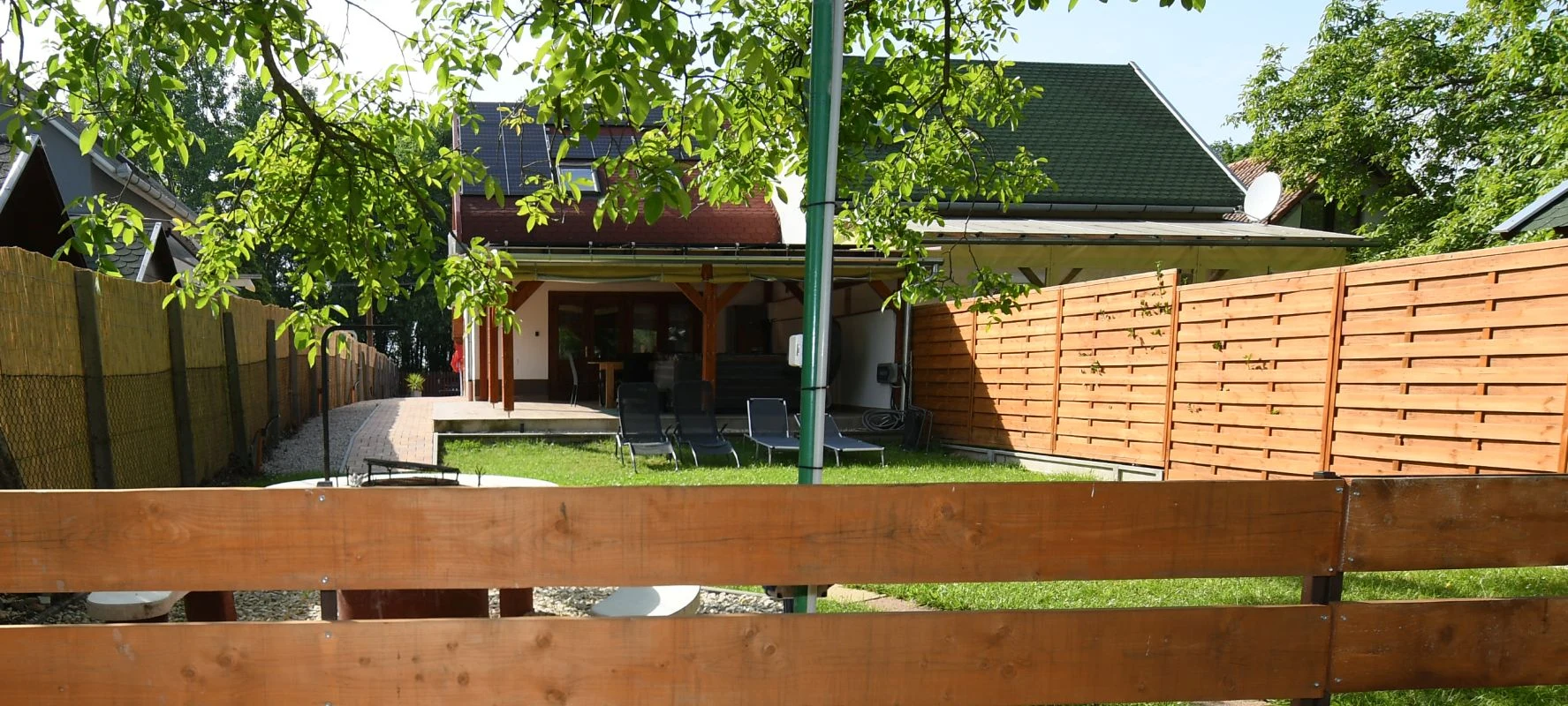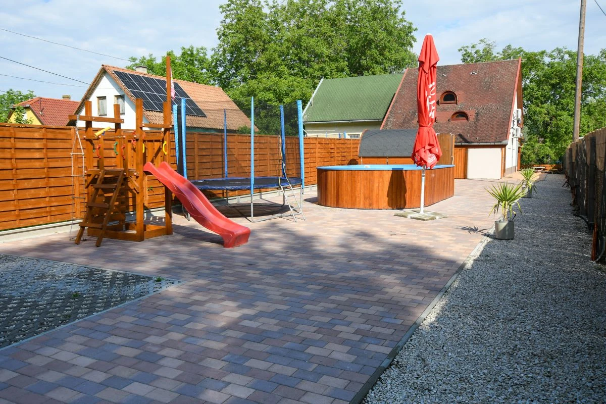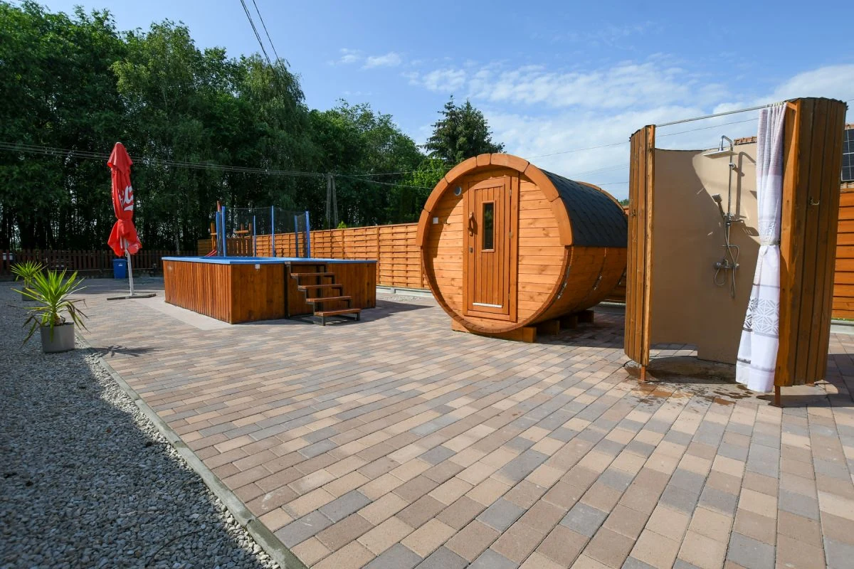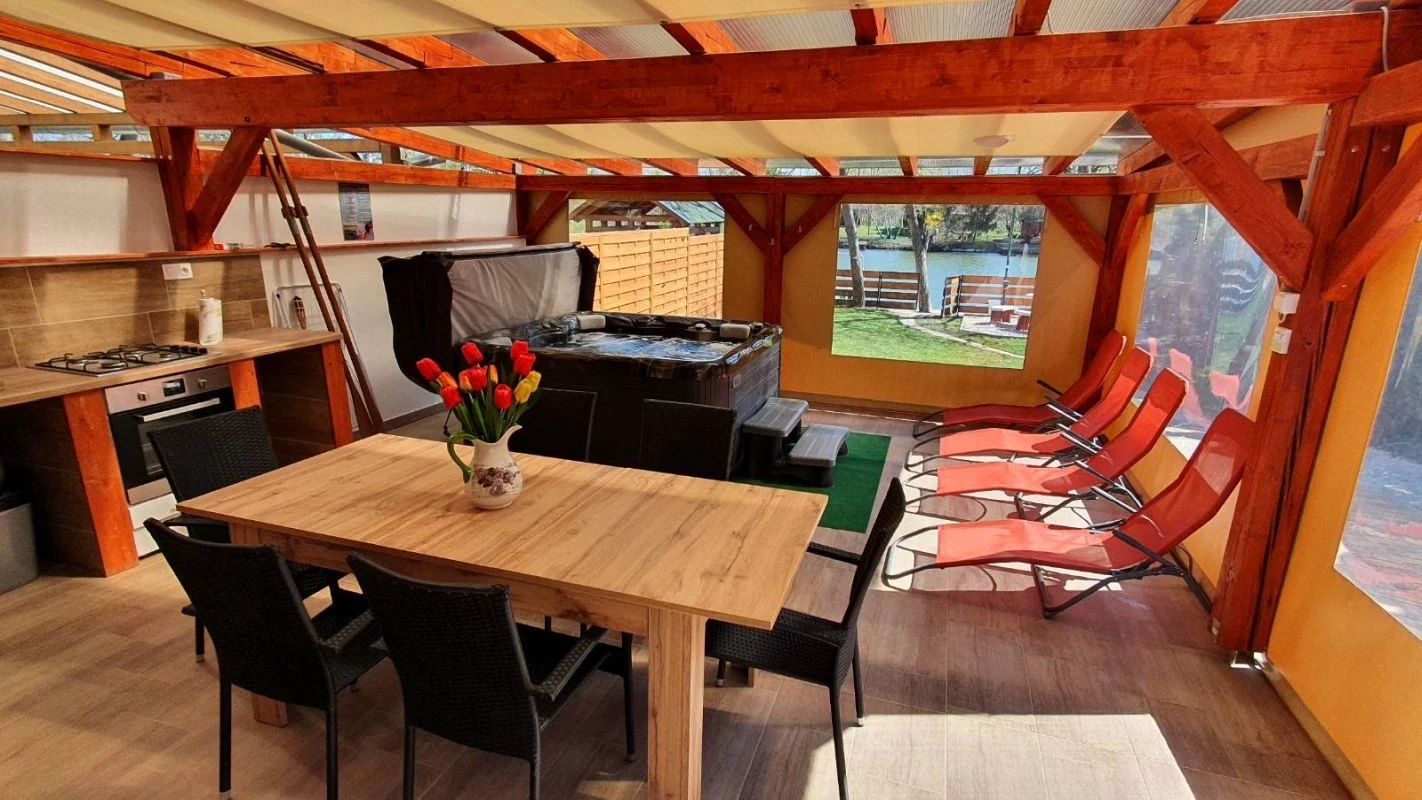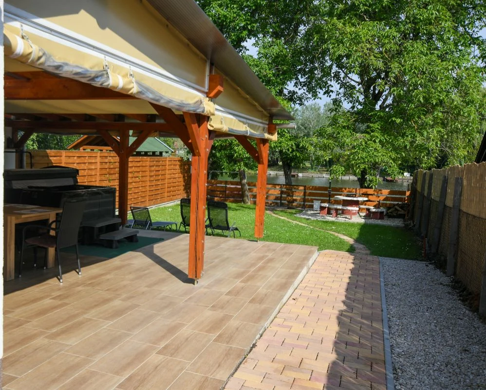 A fedett teraszon a hangulatos nyári konyha mellett helyet kapott egy étkező is, valamint egy 5 személyes jacuzzi gyönyörű kilátással a vízpartra. A kertben kültéri kiépített sütögető (grill, nyárs) és bográcsozó is található, az ehhez szükséges tűzifáról azonban kedves Vendégeinknek szükséges gondoskodni.Az udvaron a gyerekek részére egy trambulin és egy rönkfából készült csúszdás mászóka biztosítja a felhőtlen játék örömét. Emellett található a 3x5 méteres medence, finn hordó szauna valamint kinti tusoló és WC.