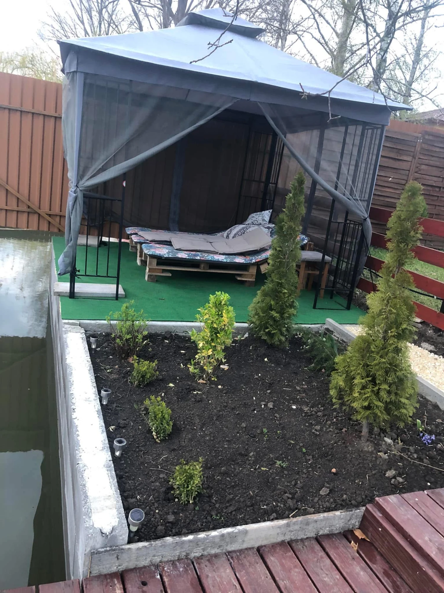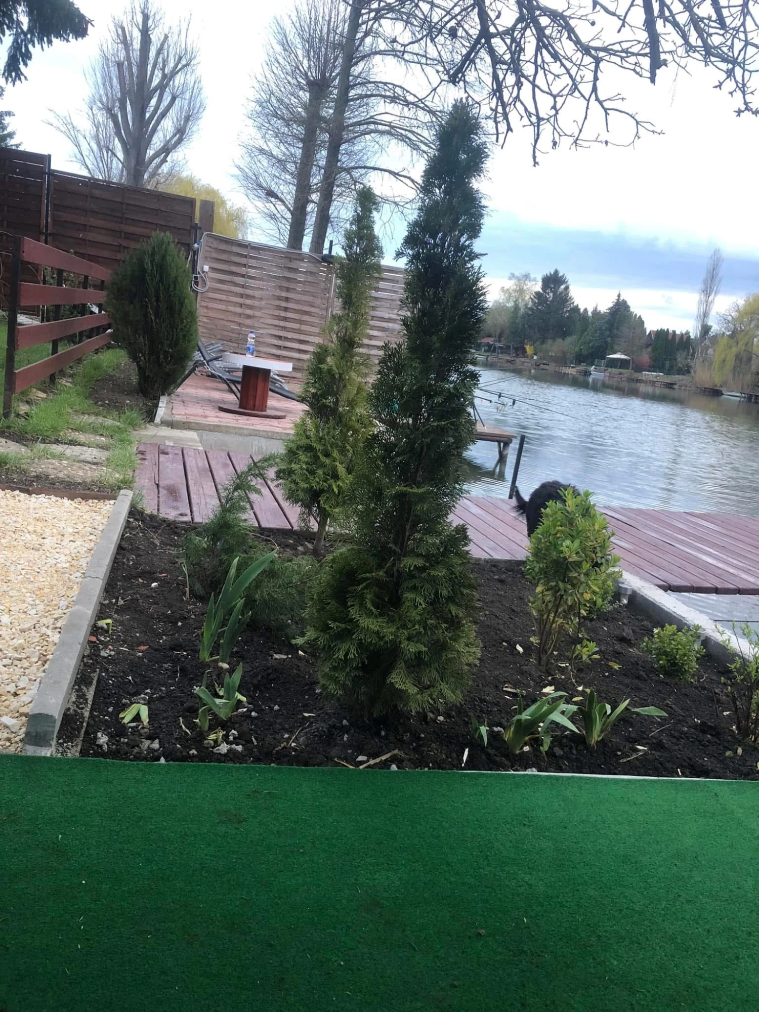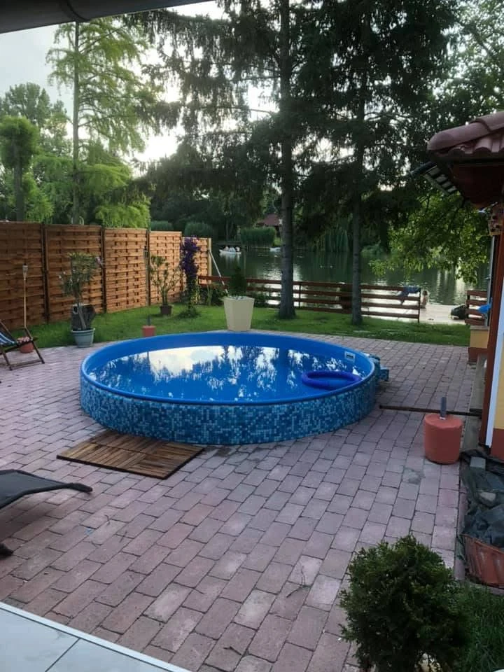 A nappaliból kilépve egy hangulatos fedett, üvegfalas terasz fogadja Vendégeinket, ahol finn szauna, valamint 6 személyes rattan bútor biztosítja a kényelmet. Szintén itt található egy tűzhellyel és mosogatóval felszerelt nyári konyha. A kertben a Holt-Körösre néző kilátással egy 3 x 1,2 méteres kör alkú medence gondoskodik a kikapcsolódásról, továbbá 6 napozóágy biztosítja a nyugodt pihenést. Az udvarban szabadtéri sütögető illetve bográcsozóhely csábítja Vendégeinket a kültéri főzésre, melyhez grill, bogrács, nyársak biztosítottak, viszont a tűzifáról kedves Vendégeinknek szükséges gondoskodni. A 14 méter széles kiépített vízpart és a 10 nm-es stég lehetőséget ad horgászatra, napozásra, a csónakkal pedig lehetőség nyílik a festői vízpart bebarangolására. A 4 oldalról zárt udvarban 3-4 gépkocsi parkolása biztosított. A gyerekeket egy trambulin várja az udvarban.A kert, vízpart területe biztonsági kamerákkal ellátott.