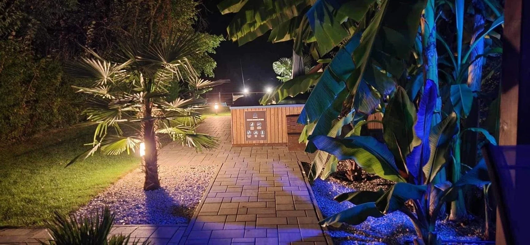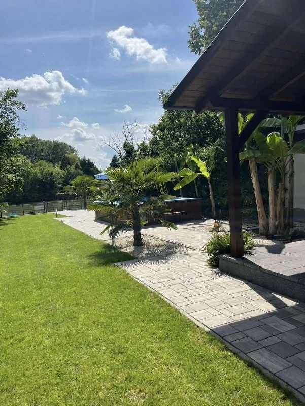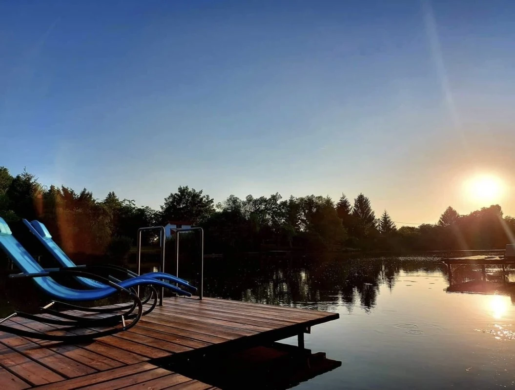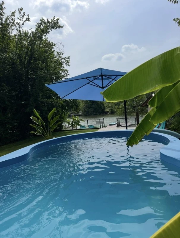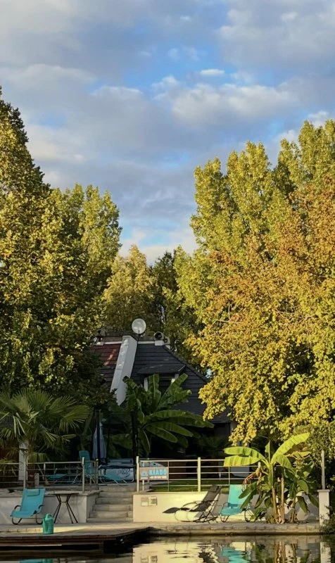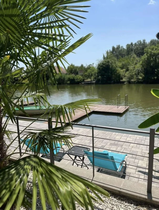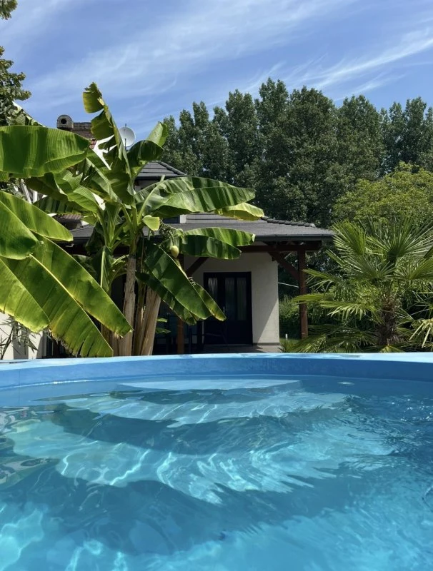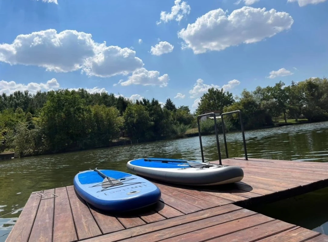 Az épületből kilépve egy fedett, kerti bútorokkal és étkezőasztallal berendezett teraszon gyönyörködhetünk a mediterrán hangulatú, pálmafákkal és banánfákkal díszített kertben. A terasz mellett található egy napernyővel árnyékolt, 5 x 3 m nagyságú és 120 cm mélységű, felár ellenében fűthető medence gyönyörű kilátással a vízpartra (a medence fűtése időjárás függvényében érhető el, amennyiben az éjszakai minimumok meghaladják a 10-15 Celsius fokot). A kertben kiépítésre került egy kültéri sütögető (grill, nyárs) és bográcsozó, melyhez a szükséges tűzifa is biztosított. A kikapcsolódáshoz a kertben és a kiépített vízparton 8 db napozóágy áll rendelkezésre. Az udvaron a gyerekek részére egy trambulin, csúszda és hinta biztosítja a felhőtlen játék örömét,A 12 méter széles, kiépített vízparthoz egy 10 m²-es, „T” alakú stég kapcsolódik, melynek teljes szélességében napozásra, horgászatra nyílik lehetőség. Az aktív pihenést kedvelők 2 db SUP segítségével barangolhatják be a holtágat, melyekhez 2 db mentőmellény is tartozik.
