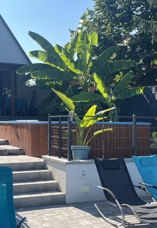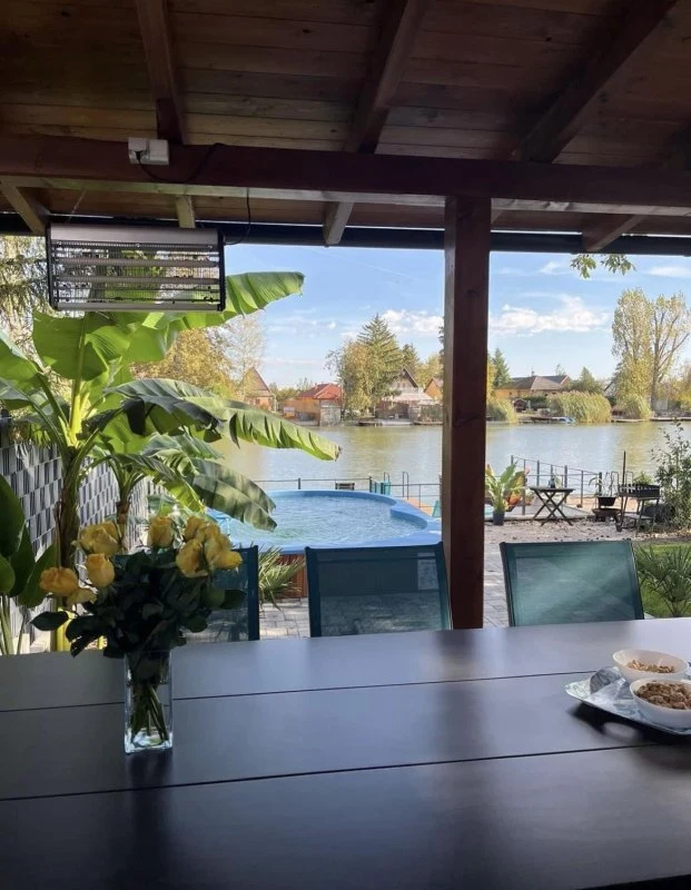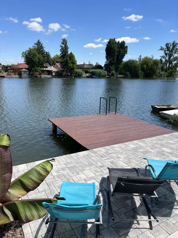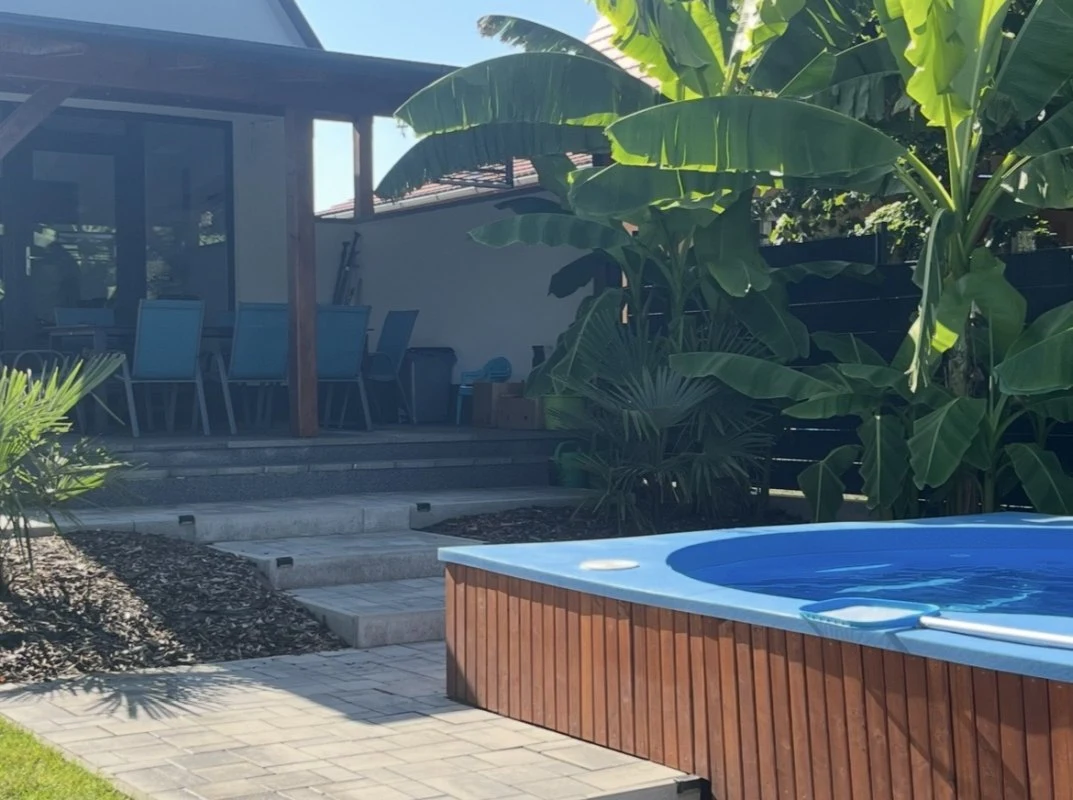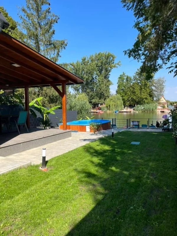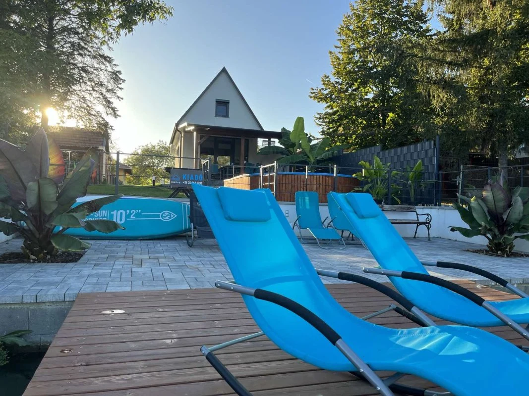 Az épületből kilépve egy fedett, kerti bútorokkal és étkezőasztallal berendezett teraszon gyönyörködhetünk a mediterrán hangulatú, pálmafákkal és banánfákkal díszített kertben. A terasz mellett található egy napernyővel árnyékolt, 5 x 3 m nagyságú és 120 cm mélységű, felár ellenében fűthető medence gyönyörű kilátással a vízpartra (a medence fűtése időjárás függvényében érhető el, amennyiben az éjszakai minimumok meghaladják a 10-15 Celsius fokot, tehát általában májustól szeptember végéig). A kertben kiépítésre került egy kültéri sütögető (grill, nyárs) és bográcsozó, melyhez a szükséges tűzifa is biztosított. A kikapcsolódáshoz a kertben és a kiépített vízparton napozóágyak állnak rendelkezésre. Az udvaron a gyerekek részére egy trambulin, csúszda és hinta biztosítja a felhőtlen játék örömét.A 12 méter széles, kiépített napozóterasszal ellátott vízparthoz egy 10 m²-es stég kapcsolódik, melynek teljes szélességében napozásra, horgászatra nyílik lehetőség.