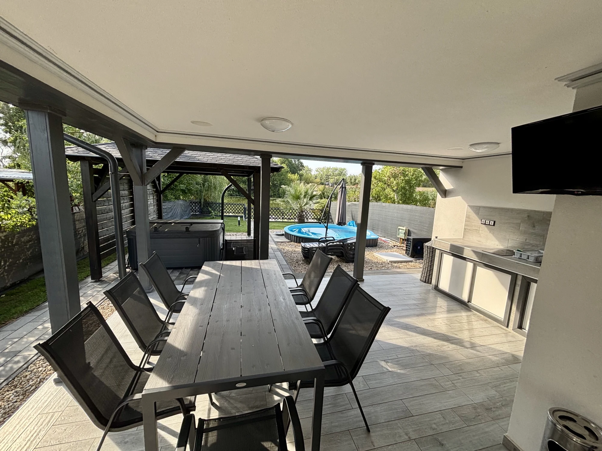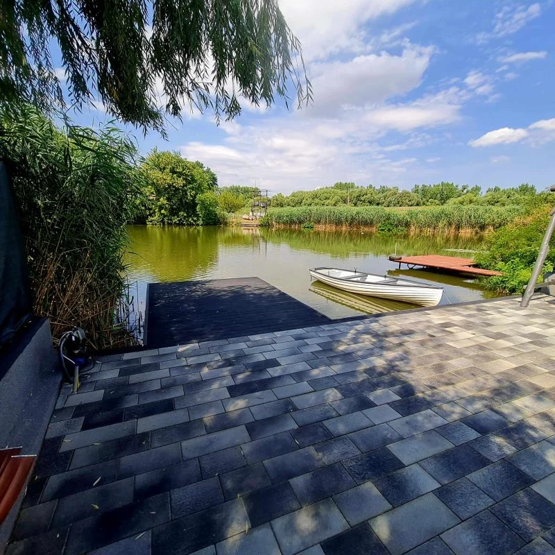 Az épületből kilépve egy 30 négyzetméteres fedett terasz fogad, ahol egy 8 férőhelyes étkezőasztal valamint egy kerámiás főzőlappal és mosogatóval felszerelt nyári konyha került kialakításra. A teraszról gyönyörű a kilátás az egzotikus növényekkel beültetett kertre. A pihentető kikapcsolódásról a kertben egy 3,6 m átmérőjű kerek, hidromasszázs fúvókákkal ellátott, szezonálisan fűthető (május 1. – szeptember 30. között, 29-30 Celsius fokra felfűtött) medence valamint egy 4 ülő és 1 fekvőhellyel rendelkező jauczzi gondoskodik. A kertben napozóágyak, szolárzuhanyzó és kerti csap található. Az udvaron a legkisebbeket fa játszótér várja hintával és csúszdával.A kiépített vízparton hintaágy és padokkal körbeölelt kerti sütögető található. Grillt és bográcsot, valamint az ezekhez szükséges gázpalackot és gázzsámolyt biztosítunk kedves Vendégeinknek. A 11 méter széles vízpart és a 3 x 4 méteres stég lehetőséget ad a horgászatra, napozásra vagy épp csónakkal fedezhetik fel a festői táj szépségeit. A nyaraló négy oldalról zárt a gyermekek biztonsága érdekében.