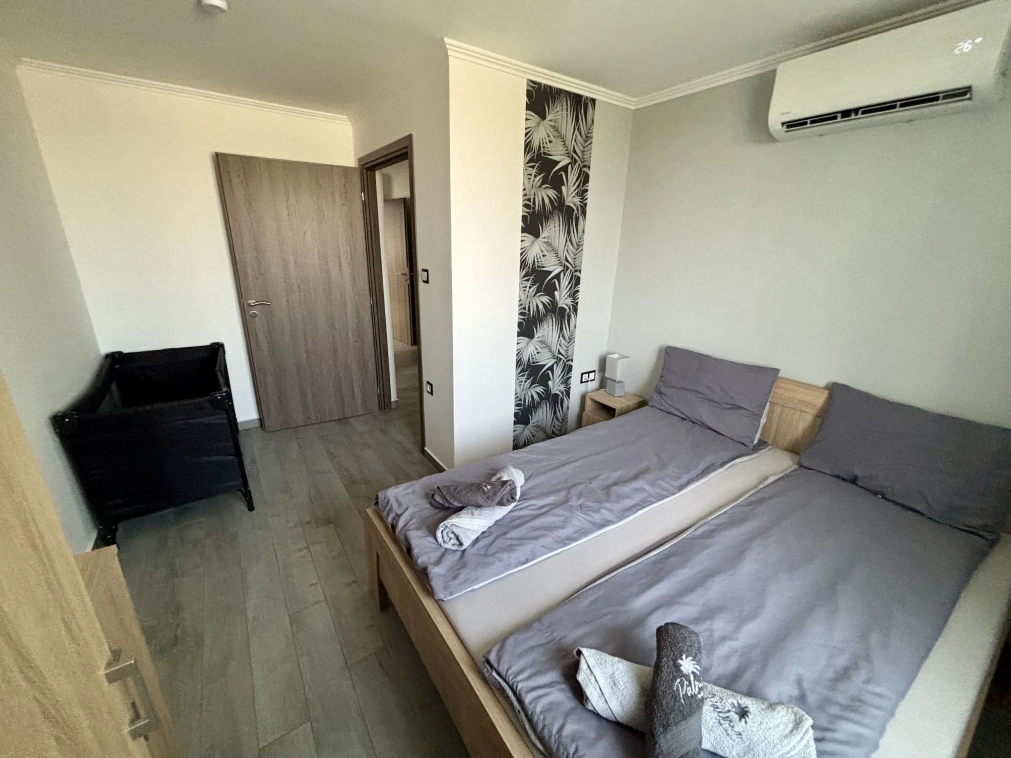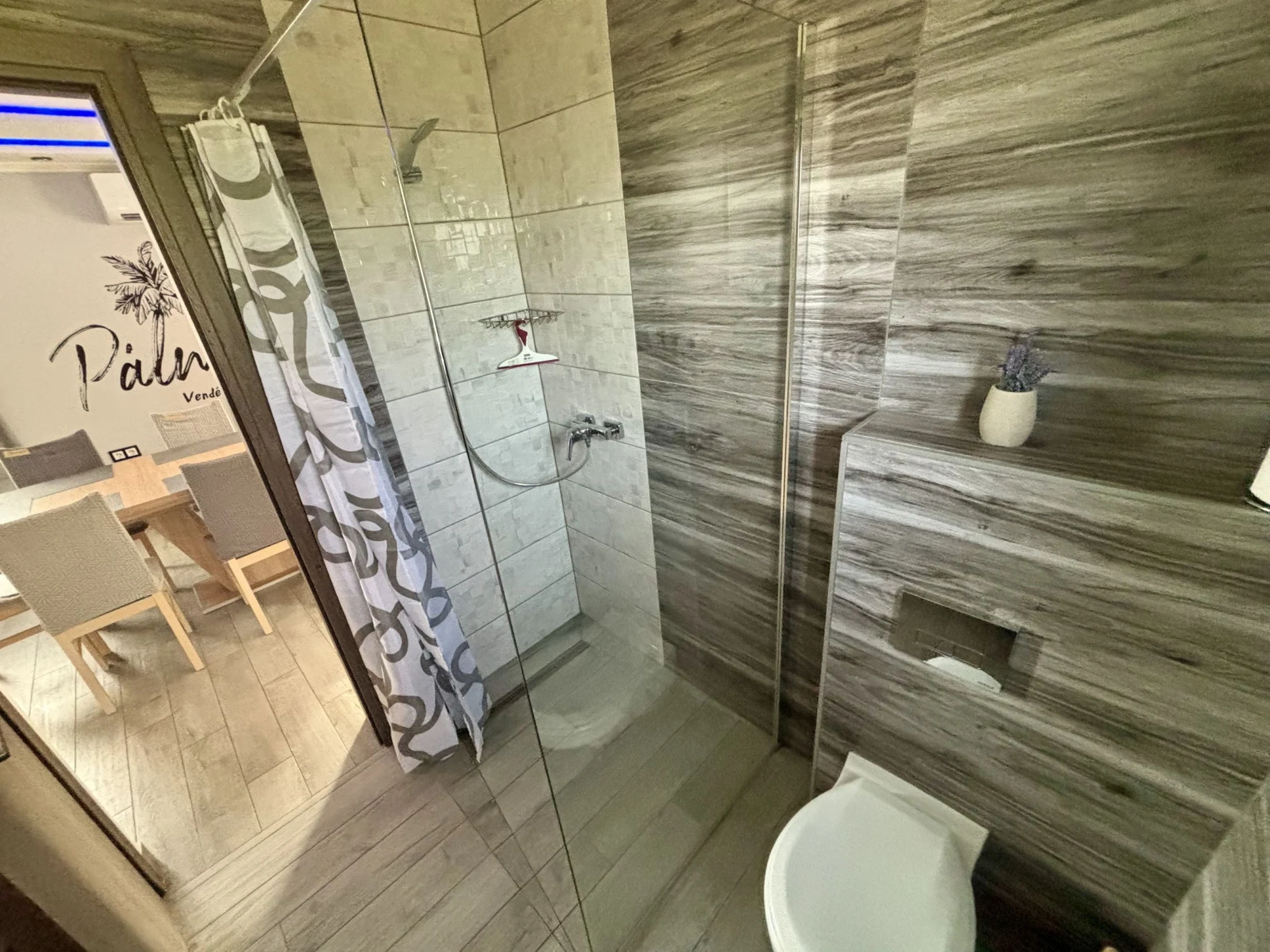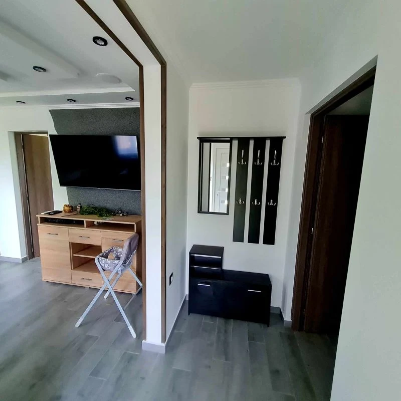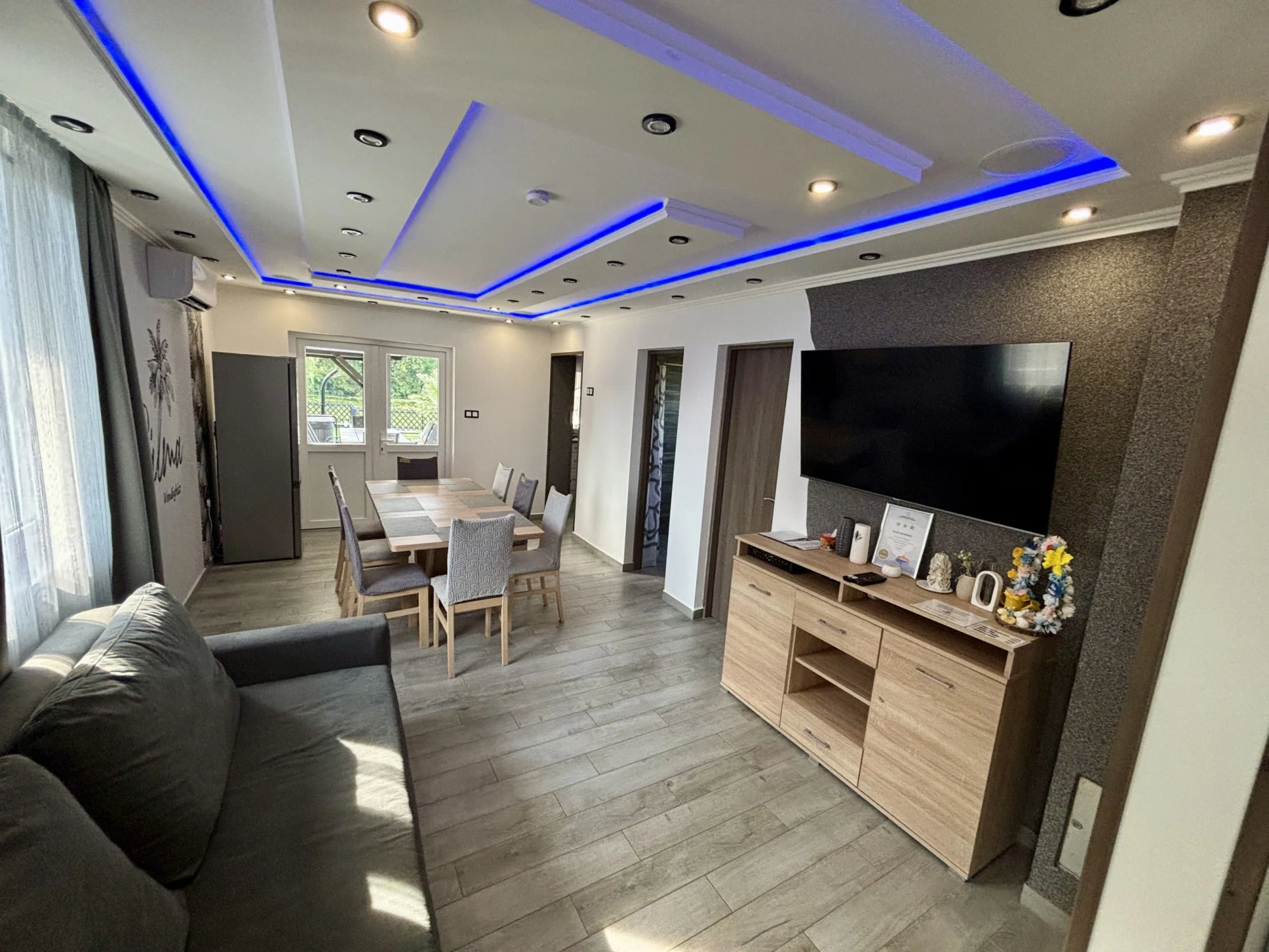 Az egyszintes, 6+2 személyes, 3 hálószobás +2 fürdőszobás, klimatizált nyaralóba belépve egy előszoba fogadja kedves Vendégeinket ruhafogassal és cipősszekrénnyel felszerelve. Innen nyílik a nappali és az étkező, ahol találunk egy 2 személy részére pótágyazható kanapét, komódot, falra szerelt 55”-os okostévét valamint egy hifirendszert, melynek 4 hangszórója a nappaliban található, 4 pedig a teraszon került elhelyezésre. Az étkezőben egy 8 férőhelyes étkezőasztal várja Vendégeinket. Ebből a közös térből nyílik egy zuhanyzóval, WC-vel, elektromos törölközőszárítós radiátorral felszerelt fürdőszoba (mely külső bejárattal is rendelkezik) és egy jól felszerelt konyha, melyben minden megtalálható, ami a főzéshez szükséges: indukciós főzőlap, légkeveréses sütő, mosogatógép, kávéfőző, mikrohullámú sütő, kombi hűtőszekrény, vízforraló, kenyérpirító, és étkészlet poharakkal. A közös helyiségektől egy ajtó választja el a folyosót, amiből 3 db hálószoba és 1 WC-vel, zuhanyzóval kialakított fürdőszoba nyílik. A szobák közül az egyik egy franciaággyal rendelkezik, a másik kettő két-két egyszemélyes ággyal felszerelt szoba. Mindhárom klimatizált szoba éjjeliszekrénnyel, lámpával, komóddal és gardróbszekrénnyel felszerelt.Kisgyermekek részére babakád, etetőszék és egy utazóágy is rendelkezésre áll.