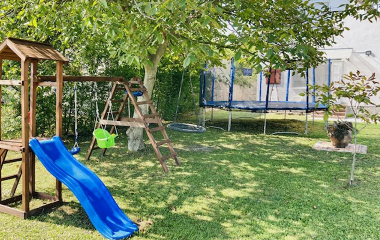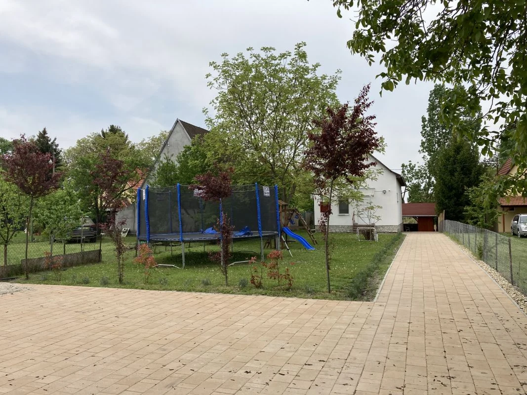 Emellett a négy oldalról zárt kertben hinta, mászóka, csúszda illetve trambulin várja a kisebbeket.