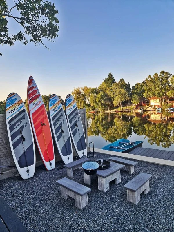 A vízpart felőli apartman nagy, hidegebb időben körbeponyvázott teraszán található egy 8 személyes asztal székekkel, mellette egy melegvizes 5 személyes jacuzzi, ami este színes fényjátékkal teszi hangulatossá a fürdőzést.A kialakított zuhany után található egy éjszakai hangulatvilágítással ellátott 3,5 m x 9 m hosszú és 1,40 m mély, szezonálisan (áprilistól októberig) fűthető medence, amelyben egy sekélyebb rész is kialakításra került lépcsővel. Mellette napozóágyak biztosítják a pihenést a Holt-Körös látványával. A 12 méter széles vízpart mellett került kialakításra a sütögető illetve bográcsozó, amihez biztosított a tűzifa, bogrács, rács, grill és nyársak. A 20 négyzetméteres stég horgászatra is alkalmas. Az aktív pihenést kedvelők a nyaralóhoz tartozó 4 db SUP-pal, vízibiciklivel fedezhetik fel a Körös holtág szépségeit.
