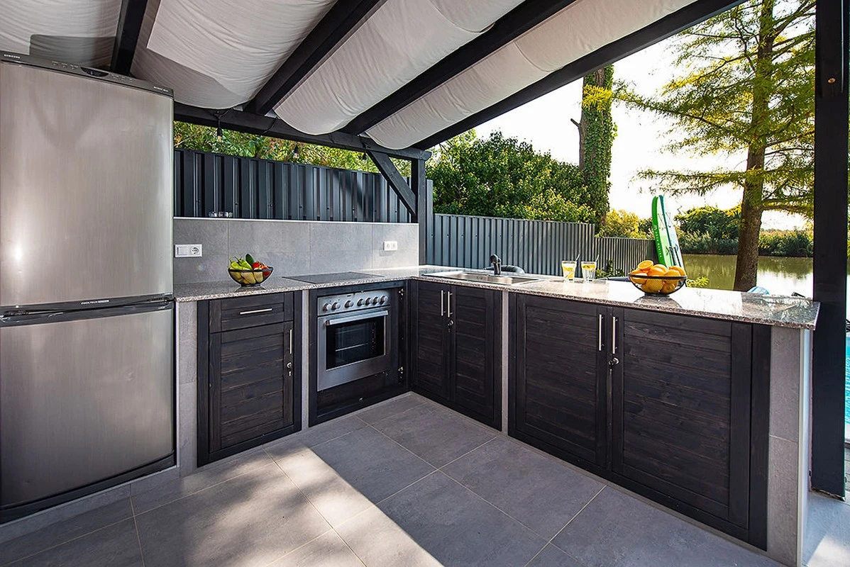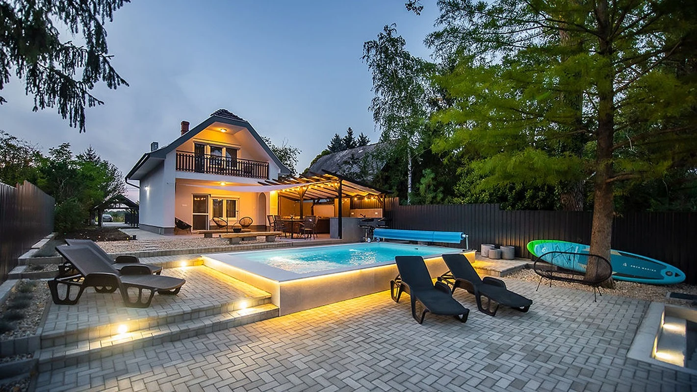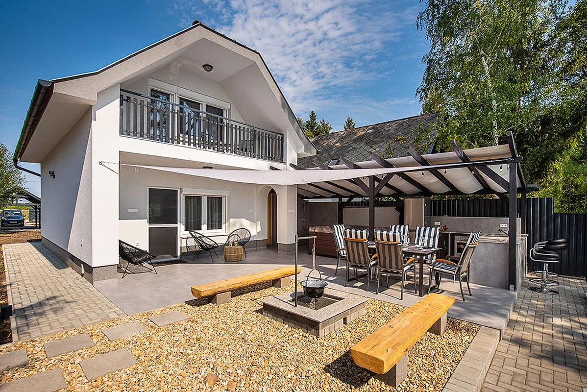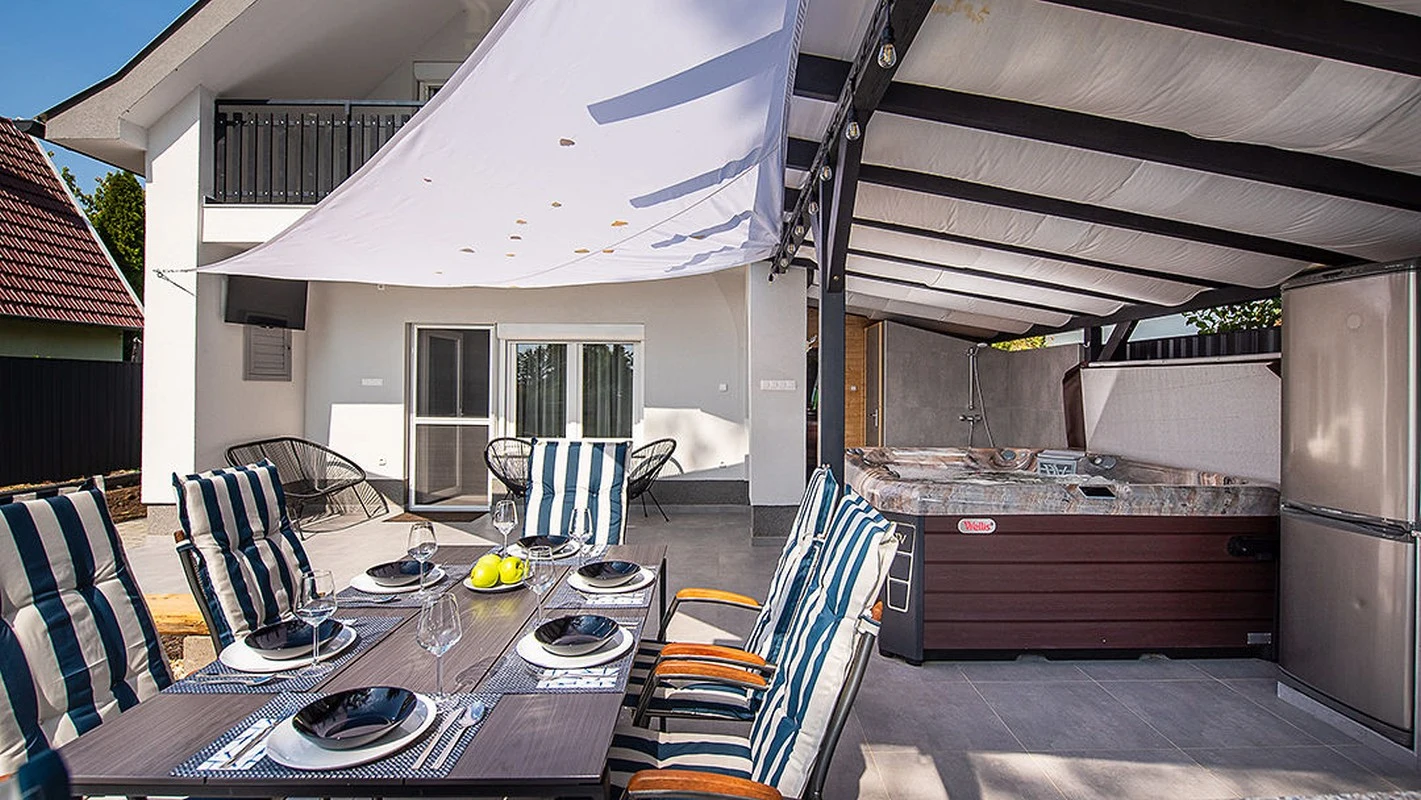 A nappaliból a vízpart felé vezető kijáraton keresztül közelíthető meg a tűzrakóhely, melynél kényelmes rönkfa padokon sütögethetnek kedves Vendégeink. Közvetlenül mellette helyezkedik el egy napvitorlával fedett nagyobb terasz 6 személyes étkezőasztallal és székekkel, egy kültéri, mosogatóval, sütővel, főzőlappal és hűtővel felszerelt konyharésszel és három bárszékkel, valamint itt kapott helyet az 5 személyes jacuzzi, egy kerti tusoló és WC, valamint a finn szauna is.A vízparthoz közelebb eső napozó teraszon található a 3,5 m x 6 m x 1,1 m-es medence napozóágyakkal és kerti bútorokkal.