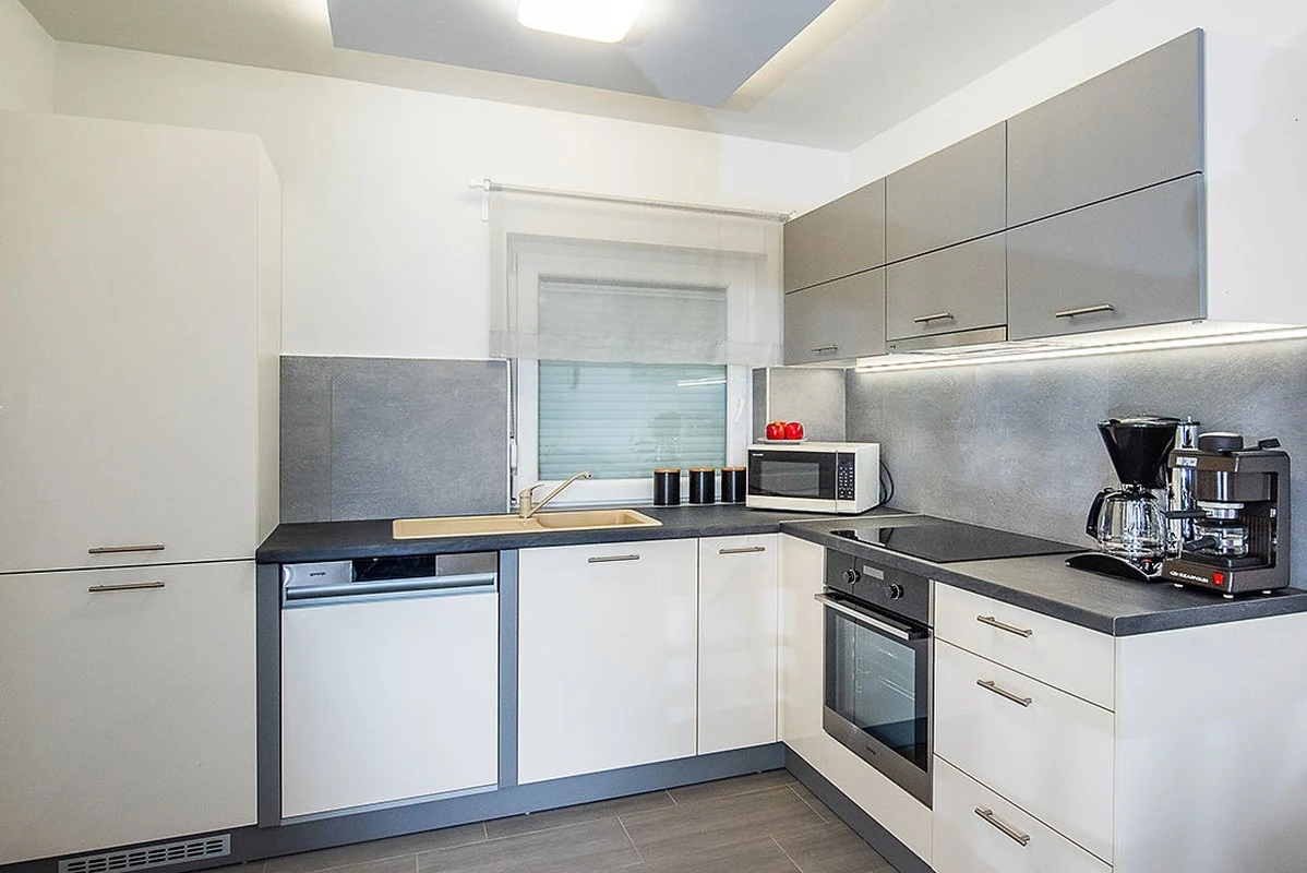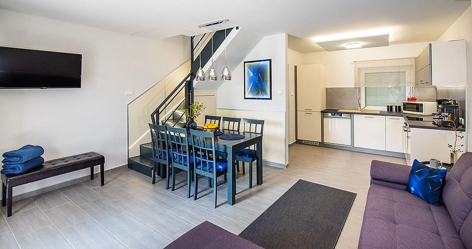 A 3+3 (+2 gyermek) részére kialakított, 2 hálószobás, klimatizált vízparti üdülő földszintjén stílusos amerikai konyhás nappali található, mely 2 személyre pótágyazható kanapéval, nagyméretű ruhásszekrénnyel, 6 személyes étkezőasztallal, síkképernyős TV-vel gondoskodik Vendégeink kikapcsolódásáról.A nappalival egy légtérben elhelyezkedő, teljesen felszerelt amerikai konyhában minden szükséges eszköz megtalálható (fagyasztórekeszes hűtő, sütő, főzőlap, páraelszívó, mosogatógép, kenyérpirító, mikrohullámú sütő, vízforraló, kávé- és teafőző, vasaló, 8 fő részére tányér, pohár- és étkészlet, edények).