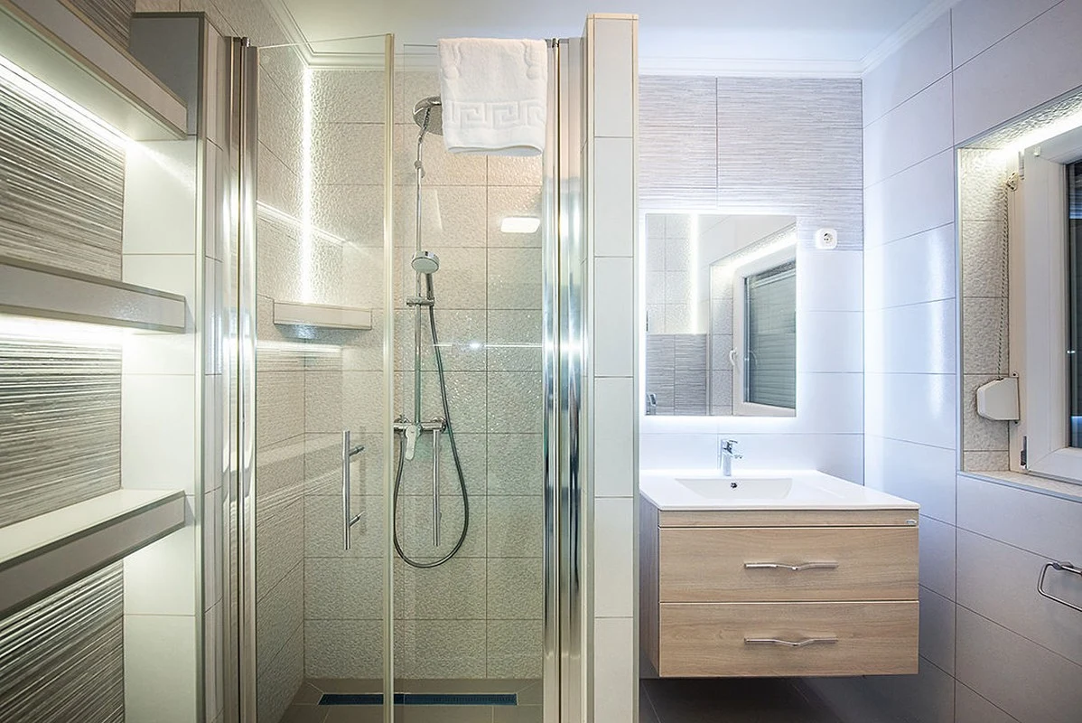 A földszinten került kialakításra továbbá a tusolóval, hajszárítóval felszerelt fürdőszoba WC-vel együtt.