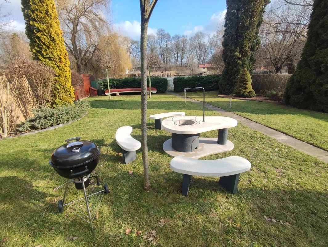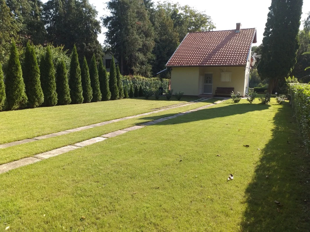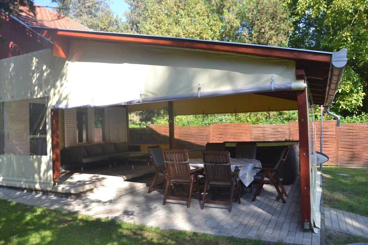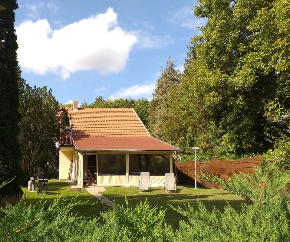 A kertbe a vízpart felé egy hangulatos, nagy méretű fedett teraszon keresztül juthatunk ki, ahol kényelmes műrattan kanapé és fa kerti bútorok valamint hintaágy járulnak hozzá a pihentető kikapcsolódáshoz. A körbeponyvázott teraszon egy 5 személyes jacuzzi is helyet kapott, a kertben pedig napozóágyak, darts és pingpongasztal csábítanak aktív kikapcsolódásra. A kinti sütögetéshez a hangulatos szalonnasütő mellett bogrács, bográcsállvány, grill és tárcsasütő és egy rekesz tűzifa is rendelkezésre áll. A bográcsozáshoz és tárcsázáshoz gázpalack biztosított gázégőkkel. A 15 méter széles vízpart és az 1,5 x 3 méteres stég lehetőséget nyújt horgászatra vagy napozásra. Emellett csónak, egy háromszemélyes kenu illetve 2 db SUP is a vendégek komfortérzetét növeli. A vízpart a gyermekek védelme érdekében kerítéssel elzárt. Mivel a stég mellett lépcső vezet le a vízhez, így a vízpart a kisebbek számára is kiválóan alkalmas fürdőzésre.A négy oldalról zárt nyaraló kertjében 3 gépkocsi részére parkolási lehetőség biztosított betonozott beállón.