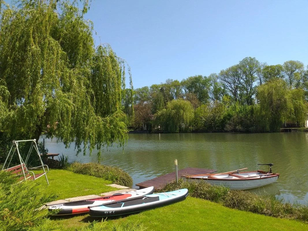 A 4+2 személyes vízparti nyaraló földszintjén egy légtérben található az ízlésesen kialakított konyha és a klimatizált nappali, melyben egy sokcsatornás TV Netflix-szel, valamint két személy részére ágyazható sarokkanapé gondoskodik a kényelemről. A konyha teljeskörűen felszerelt (gáztűzhely elektromos sütővel, mikrohullámú sütő, hűtő fagyasztóval, vízforraló, kenyérpirító, melegszendvicssütő, kávéfőző, mosogatógép, 10 főre edény- és étkészlet). Szintén a földszinten került kialakításra egy tusolós fürdőszoba és egy különálló WC mosdóval.Az emeleten két klimatizált hálószoba található, az egyikben egy franciaágy, a másikban 1 franciaágy és 1 kinyitható kanapé várja Vendégeinket. A két hálószobából egy közös erkélyre juthatunk, ahonnan páratlan kilátás nyílik a Holt-Körösre.