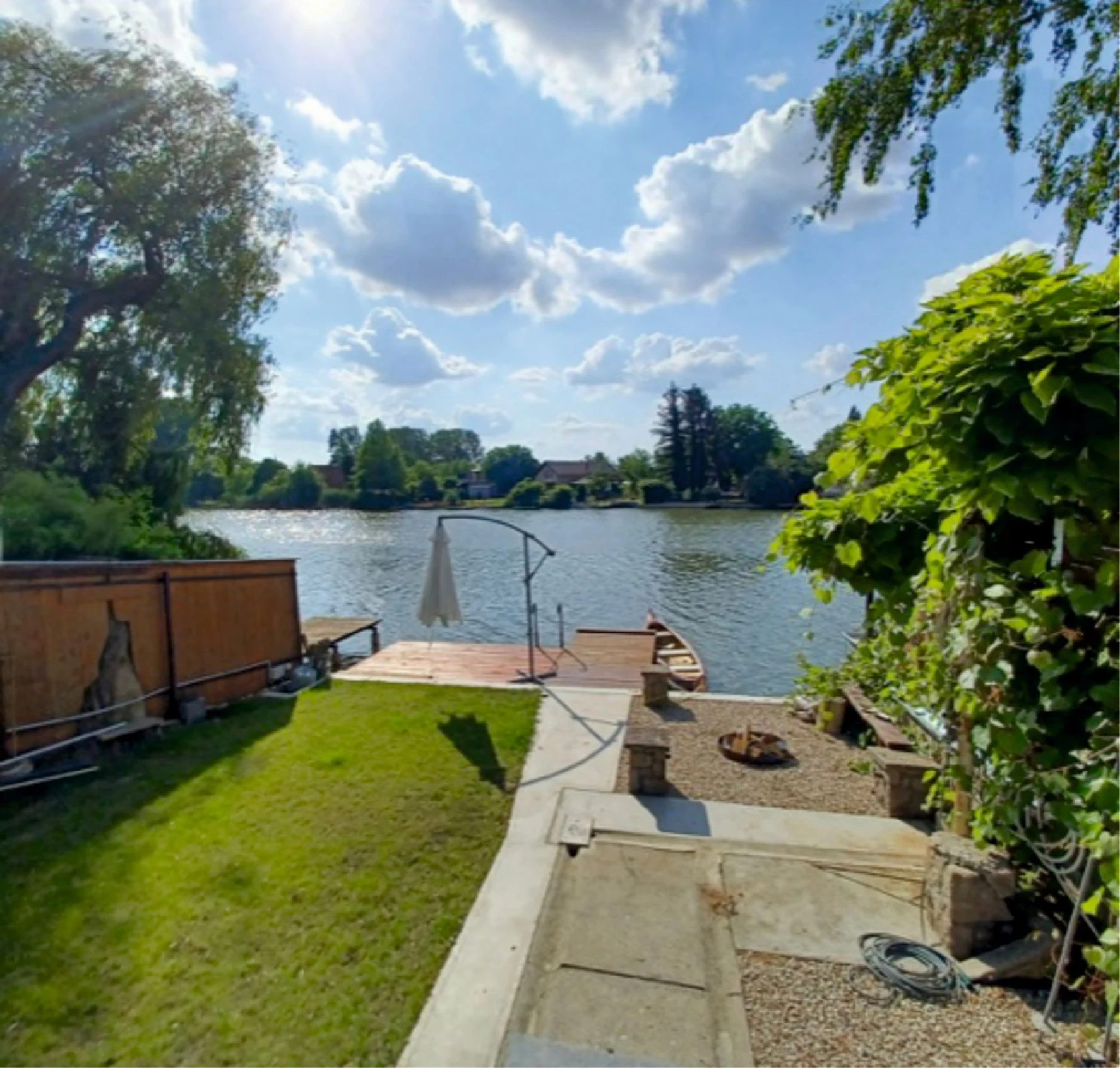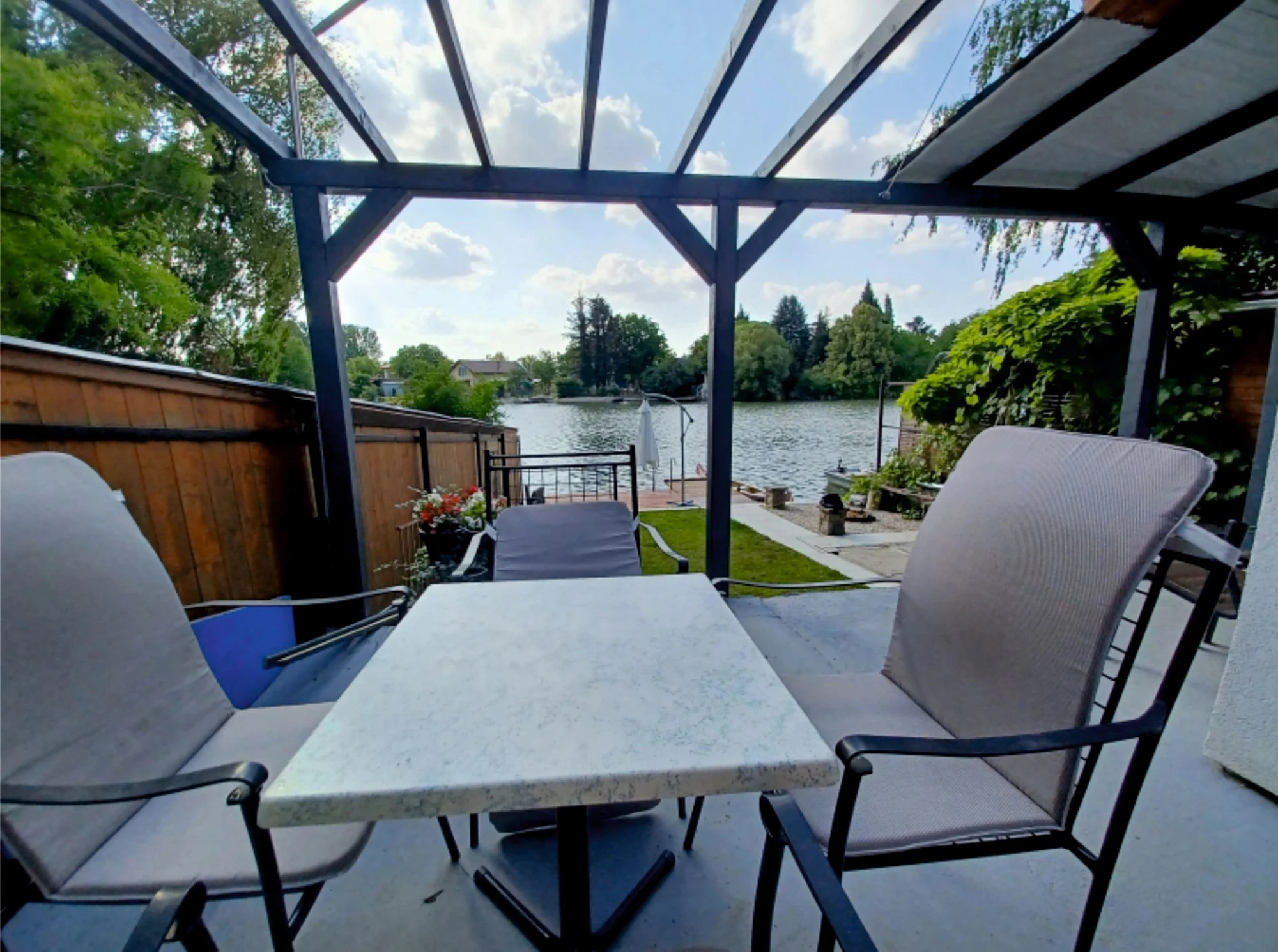 Az épületből a vízpart felé kilépve az épületet két oldalról körülölelő, fedett teraszra érkezünk, melyen kényelmes kerti bútorok, valamint egy 2 személyes, szezonálisan üzemelő mobil jacuzzi is található. A gondtalan kikapcsolódást segíti a gyönyörű kilátás a Holt-Körös partjára, melyben 2 napozóágyon is gyönyörködhetünk. Az ízlésesen kialakított kerti szalonnasütőhely használatához bogrács, grillfelszerelés és tárcsasütő is rendelkezésre áll, azonban a tűzifáról kedves Vendégeinknek szükséges gondoskodni.A kiépített 8 méter széles vízparthoz 2,5 x 1,2 méteres stég kapcsolódik, mely horgászatra és napozásra egyaránt alkalmas, a nyaralóhoz tartozó kajakkal és kenuval pedig bebarangoldható a festői vízpart. A három oldalról elkerített (vízpart felől nyitott) nyaraló előtt az utcán 2 gépkocsi részére parkolási lehetőség biztosított.