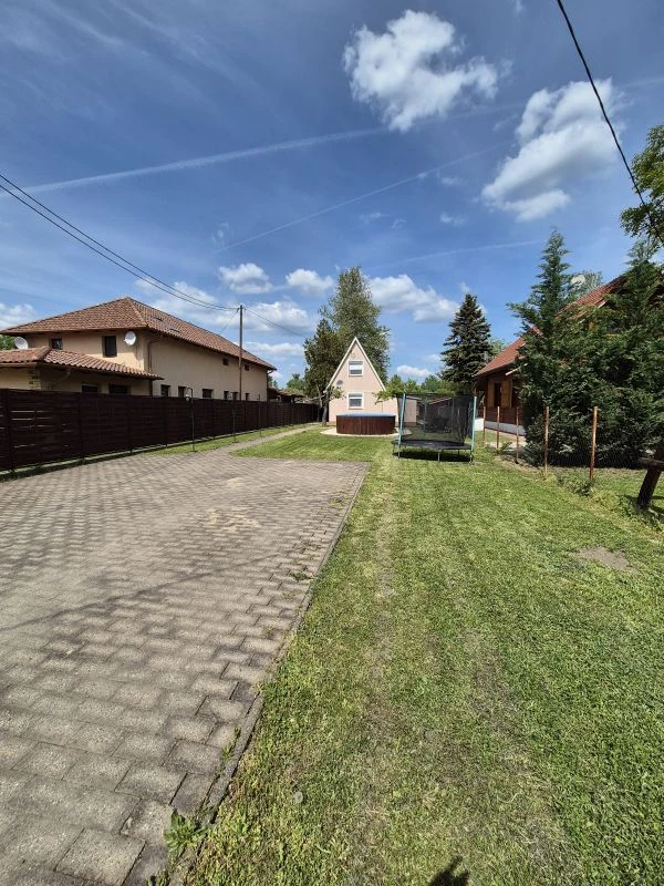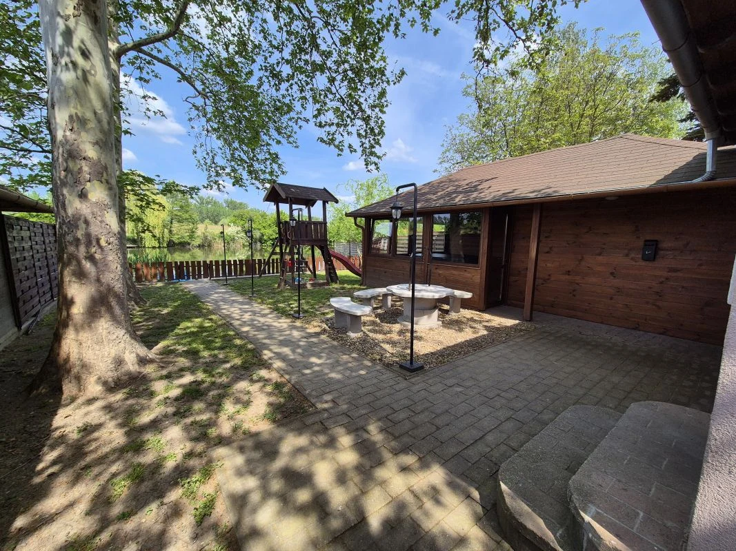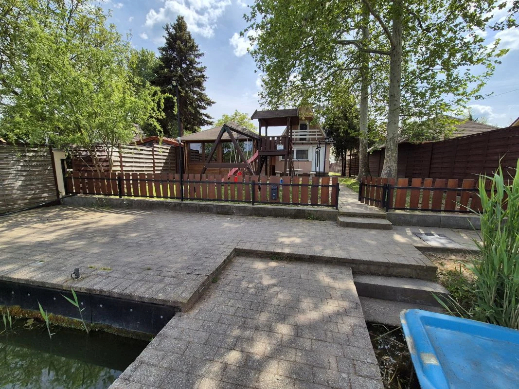A vízpart felől is elkerített kertben egy hintával és mászókával felszerelt csúszdás játszótér valamint egy trambulin várja a kisebbeket.