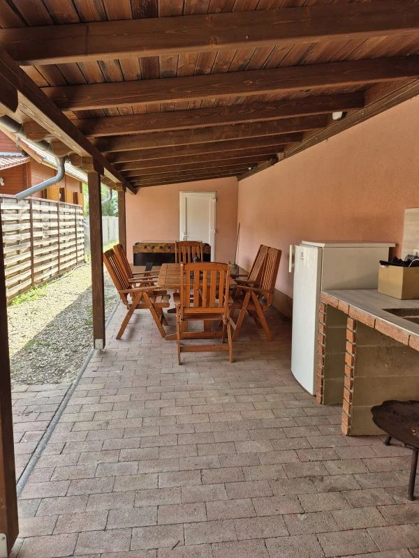 A nyaraló teraszán párnázott kerti bútorok és 8 személyes étkezőasztal valamint a díjmentesen használható pingpong- és csocsóasztal gondoskodik Vendégeink zavartalan kikapcsolódásáról. A nyári konyha mellett a kiépített kerti sütögető is használható, melyhez bogrács és nyársak állnak rendelkezésre. Az ehhez szükséges tűzifáról azonban kedves Vendégeinknek szükséges gondoskodnia vagy pedig felár ellenében biztosítjuk.Emellett egy kültéri medence, egy zárt térben található 5 személyes Wellis Palermo jacuzzi valamint finn szauna (zuhanyzóval) bővíti a wellness szolgáltatások körét.
