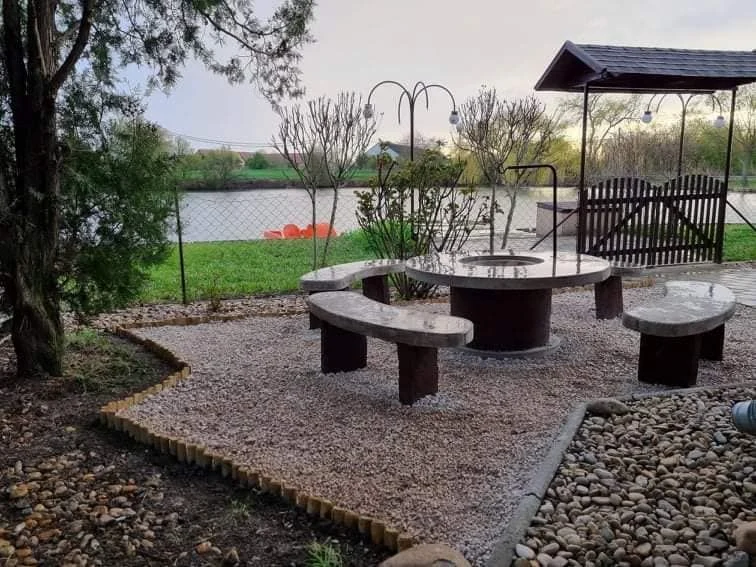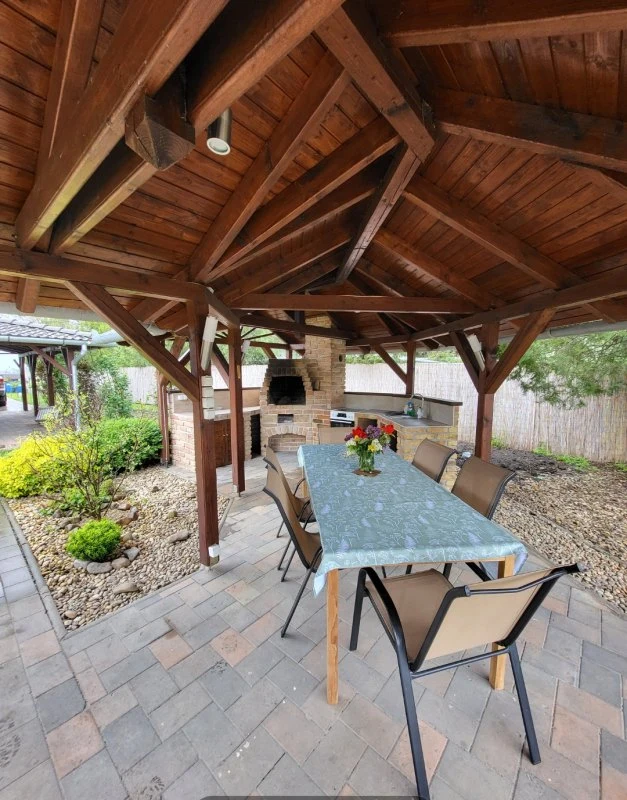 A nappaliból kilépve egy fedett terasz fogadja Vendégeinket, ahol kerti bútorokból élvezhető a vízparti közelsége. A kertben egy második, hangulatos, fedett terasz is helyet kapott; itt egy 8-15 férőhelyes étkezőasztal szolgál a közös étkezések színteréül. A kültéri sütögetéshez minden adott: kerti kemencében, valamint bográcsban, nyárson, tárcsán és grillen is elkészíthetőek a finom fogások, amelyhez a szükséges tűzifa is biztosított.Az üdülő szolgáltatásai emellett 2025-től új kültéri, szezonálisan használható medencével bővülnek.