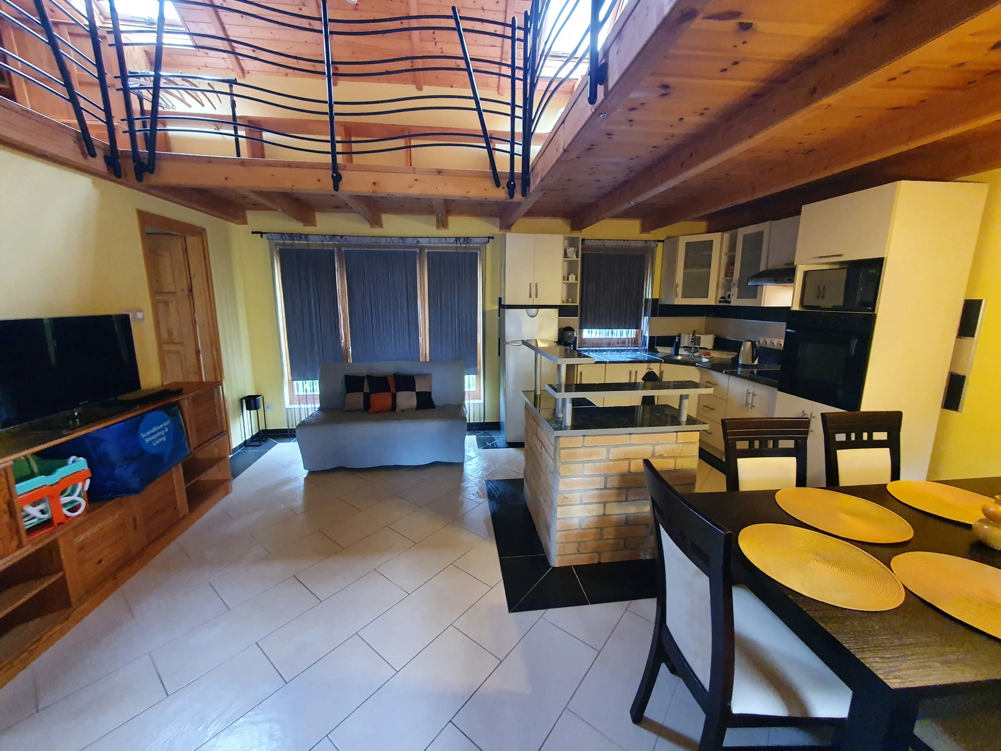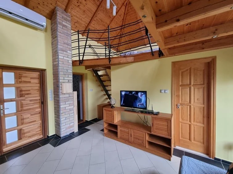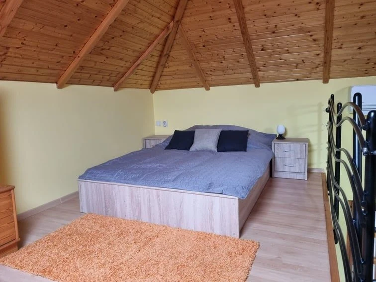 A 6+2 férőhelyes, 3 hálórészes, galériás kialakítású üdülő klimatizált földszintjén egy légtérben helyezkedik el a nappali, a konyha és a 6 személyes étkező. A nappaliban egy 2 személyes kihúzható kanapé pótágyazási lehetőséget nyújt, itt TV szolgálja Vendégeink kényelmét. A konyha teljeskörűen felszerelt (kombinált hűtőszekrény, kerámia főzőlap, sütő, mikrohullámú sütő, kenyérpirító, szendvicssütő valamint 8 főre ét-, edény- és pohárkészlet).A földszinten egy franciaágyas hálószoba, egy zuhanyzós fürdőszoba és egy külön helyiségben található WC kapott helyet. A galériás tetőtérben, egy légtérben 2 hálórész került kialakításra, ahol 1-1 franciaágy és szekrény biztosítja a kényelmet.