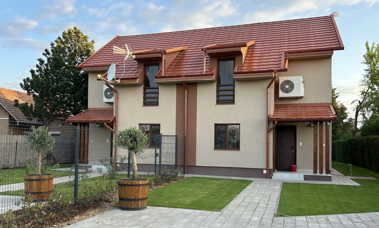 A 8+2 férőhelyes, 4 hálószobás, 2 fürdőszobás, modern kialakítású ikernyaraló klimatizált földszintjén egy légtérben helyezkedik el a nappali, a konyhasarok és az étkező. A klimatizált nappaliban TV és sarokkanapé található, mely 2 fő részére pótágyként is szolgál. A konyha teljeskörűen felszerelt (hűtőszekrény, főzőlap, sütő, mikrohullámú sütő, kenyérpirító, kávéfőző, vízforraló valamint 10 főre ét-, edény- és pohárkészlet).A földszinten egy klimatizált, franciaágyas, TV-vel felszerelt hálószoba, egy zuhanyzós fürdőszoba és egy külön helyiségben található WC kapott helyet. Az emeleten 3 db franciaágyas, klimatizált hálószoba található, melyek mindegyike TV-vel rendelkezik. Itt szintén található egy zuhanyzós fürdőszoba és vele egy helyiségben WC.