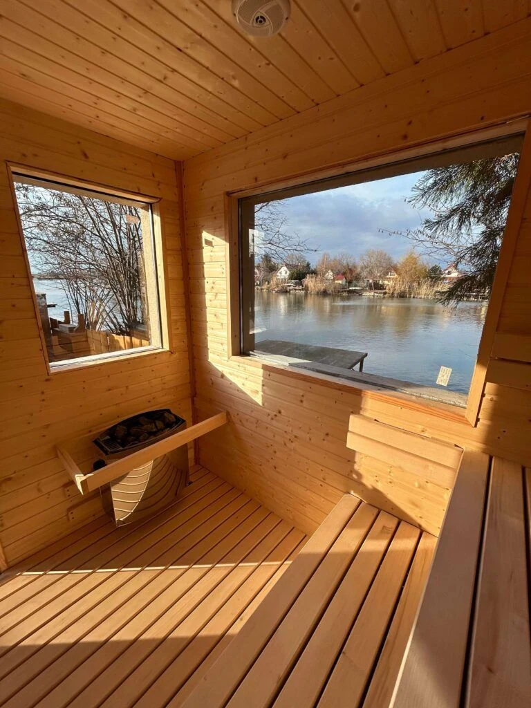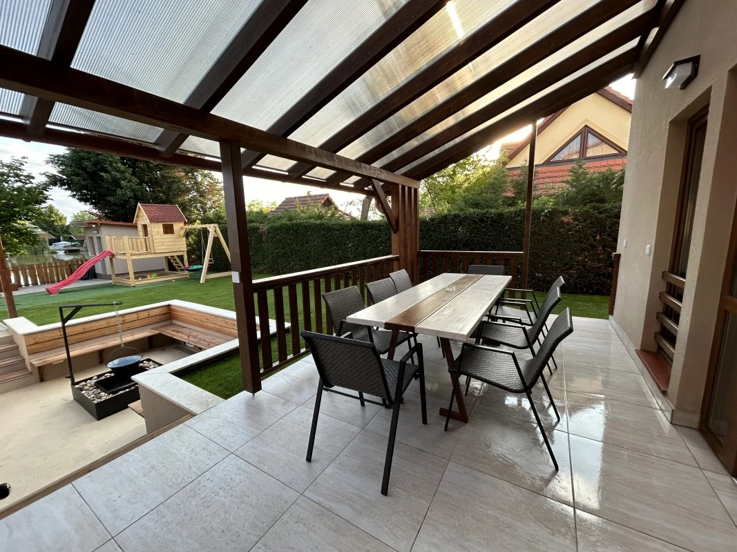 Az épületből kilépve egy fedett terasz fogadja Vendégeinket, ahol egy 8 férőhelyes kerti étkezőasztal szolgál a közös étkezések színteréül.A finn szauna melegében eltöltött pihenés ideje alatt gyönyörködhetünk a vízpart szépségeiben. A wellness élményt tovább fokozza a kertben található medence és a fatüzelésű dézsa is, mely különleges élményt nyújt akár téli hidegebb napokon is.