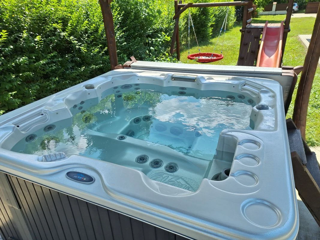 A terasz mellett, szintén fedett helyen található a 6 személyes jacuzzi, melyből a Holt-Körösre nyíló kilátás is élvezhető.