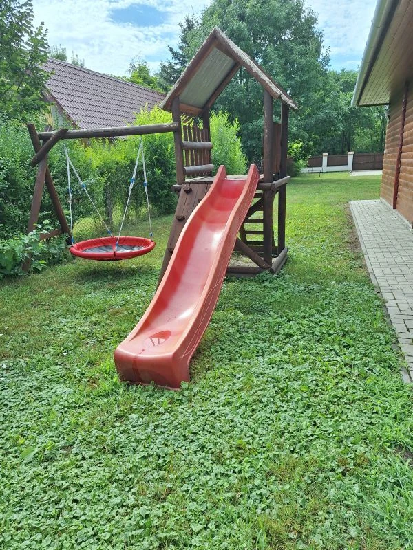 A kertben a kicsik és nagyok szórakozásáról játszótér, focikapuk és tollaslabdapálya gondoskodnak.