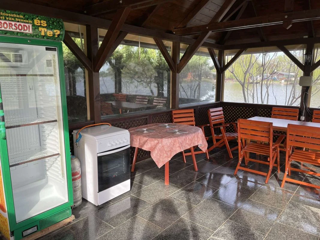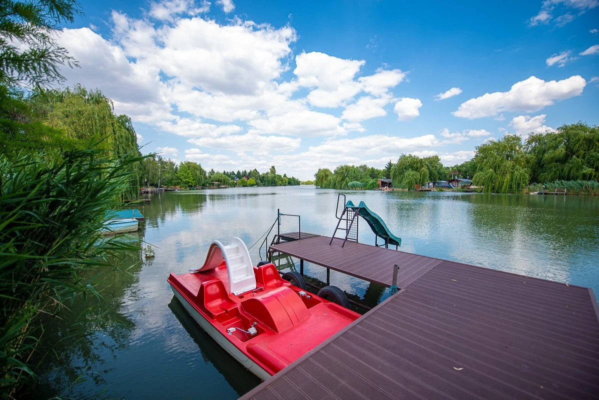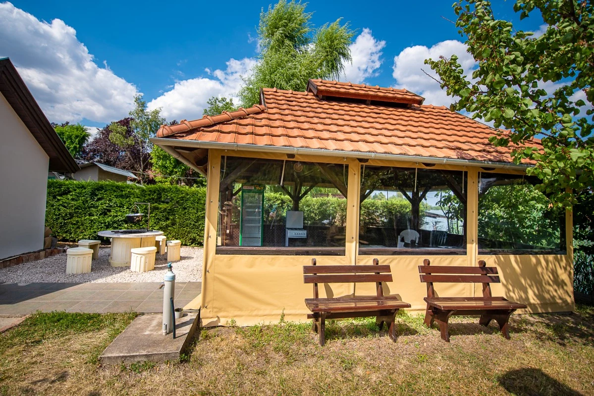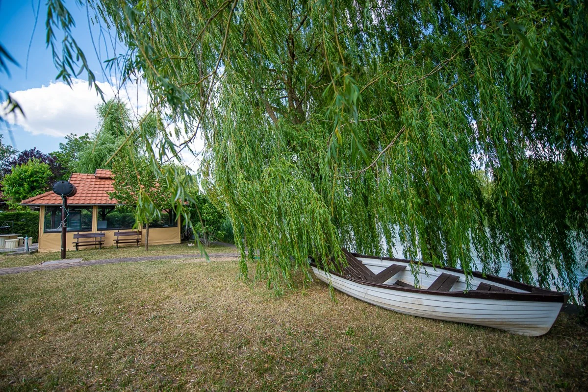 A nappaliból kilépve egy fedett, kényelmes kerti bútorokkal felszerelt terasz várja a pihenni vágyókat. Innen figyelmet igénylő lépcsők vezetnek le a kertbe. A kertben a vízparthoz közel egy nagy méretű, fedett, ponyvával körbezárt terasz/udvari konyha található, ahol gázpalackos tűzhely, egy nagyméretű hűtőszekrény, valamint 8 fő részére kerti asztal és padok fogadják Vendégeinket. A szabadtéri sütéshez grill, bogrács, nyársak biztosítottak, azonban az ehhez szükséges tűzifáról kedves Vendégeinknek szükséges gondoskodnia. A 30 méter széles kiépített vízpart úszásra, horgászatra alkalmas. A nyaraló felszereltségét bővíti a túrakenu és vízibicikli, melyekkel a holtág bebarangolható. A 20 m2-es stég mólóhoz rögzített létrával, csúszdával önfeledt fürdőzési, a horgászoknak pedig sportolási lehetőséget nyújt.A 4 oldalról zárt udvarban fedett, illetve kültéren, valamint az utcafronton 5 gépkocsi parkolására van lehetőség.