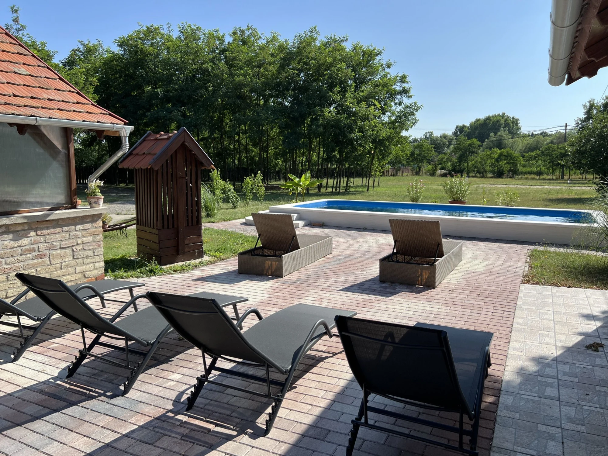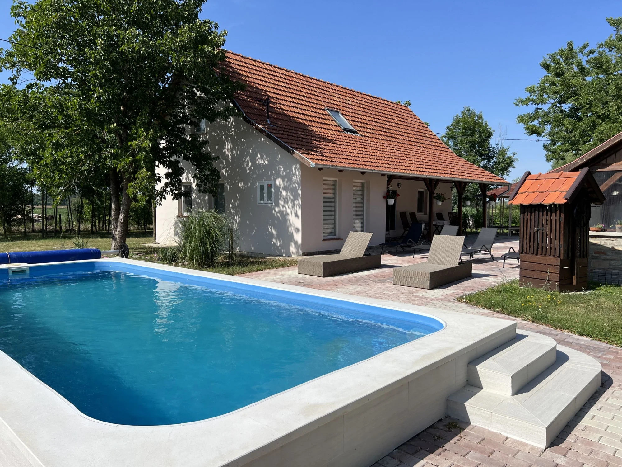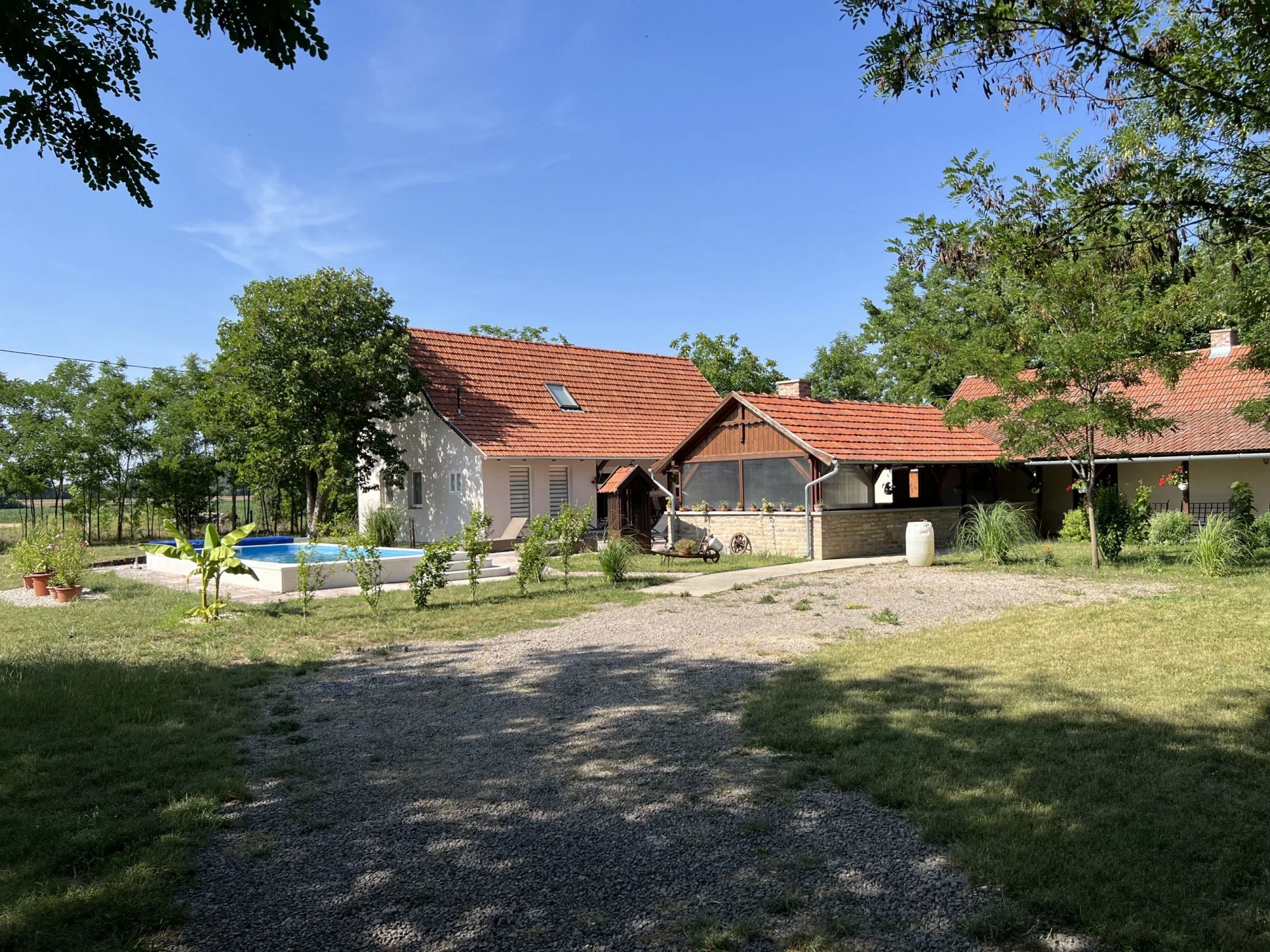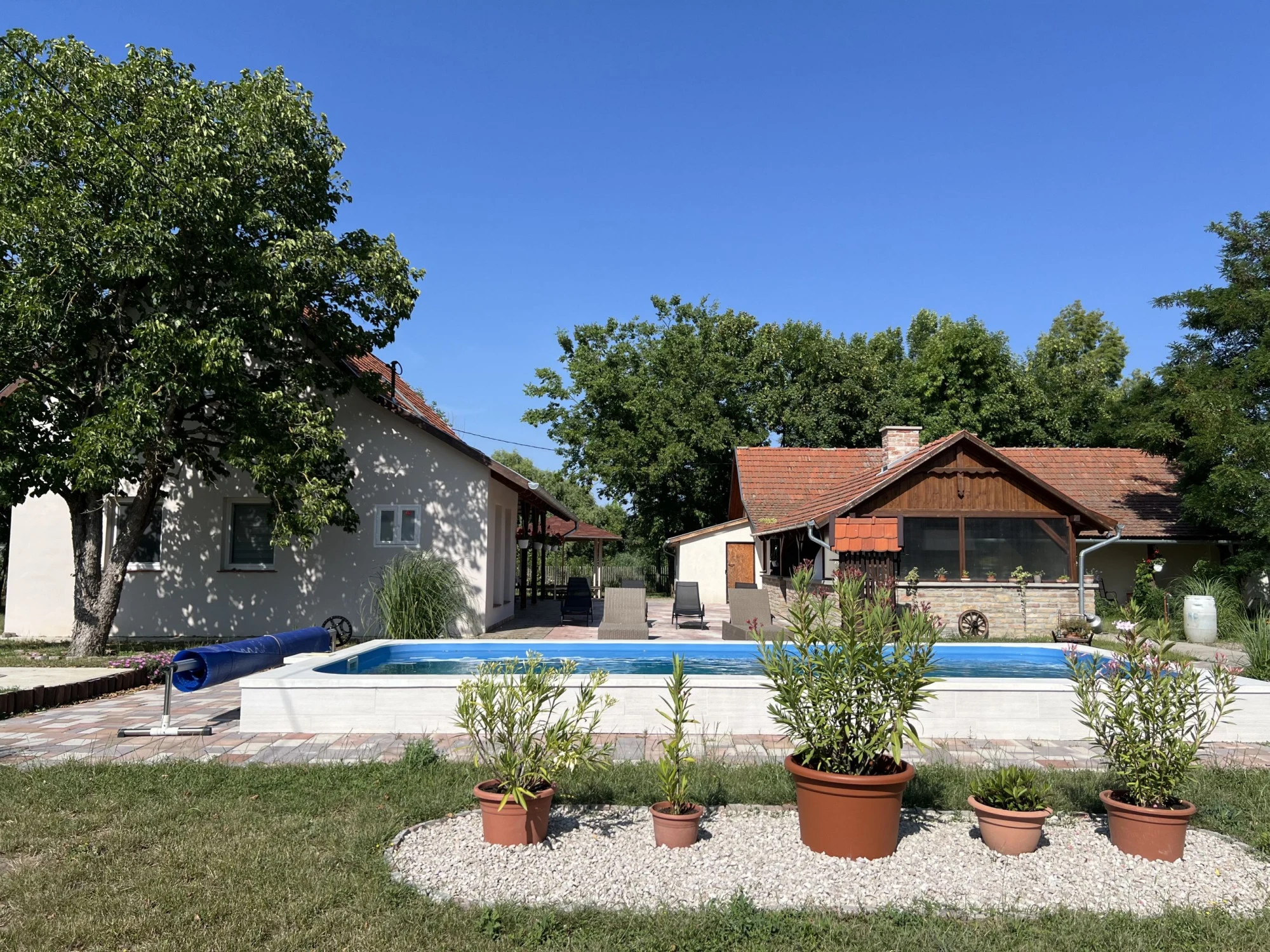 A nyugalmat árasztó, közel 6000 m²-es kertet kényelmes kerti bútorok, napozóágyak, valamint egy fedett, kemencével ellátott gasztroterasz teszik meghitté, melyhez grill, bogrács és az ehhez szükséges 1 rekesz tűzifát biztosítjuk. A szórakozást egy 3 x 7 méteres medence, valamint homokos strandröplabdapálya focikapukkal garantálja. A legkisebbek a homokozóban élvezhetik a gondtalan kikapcsolódást.A vendégházhoz saját, külön bejáratú, négy oldalról zárt vízparti telek tartozik. A két telek kb. 50 m távolságra található egymástól, közöttük egy közlekedőút fut.