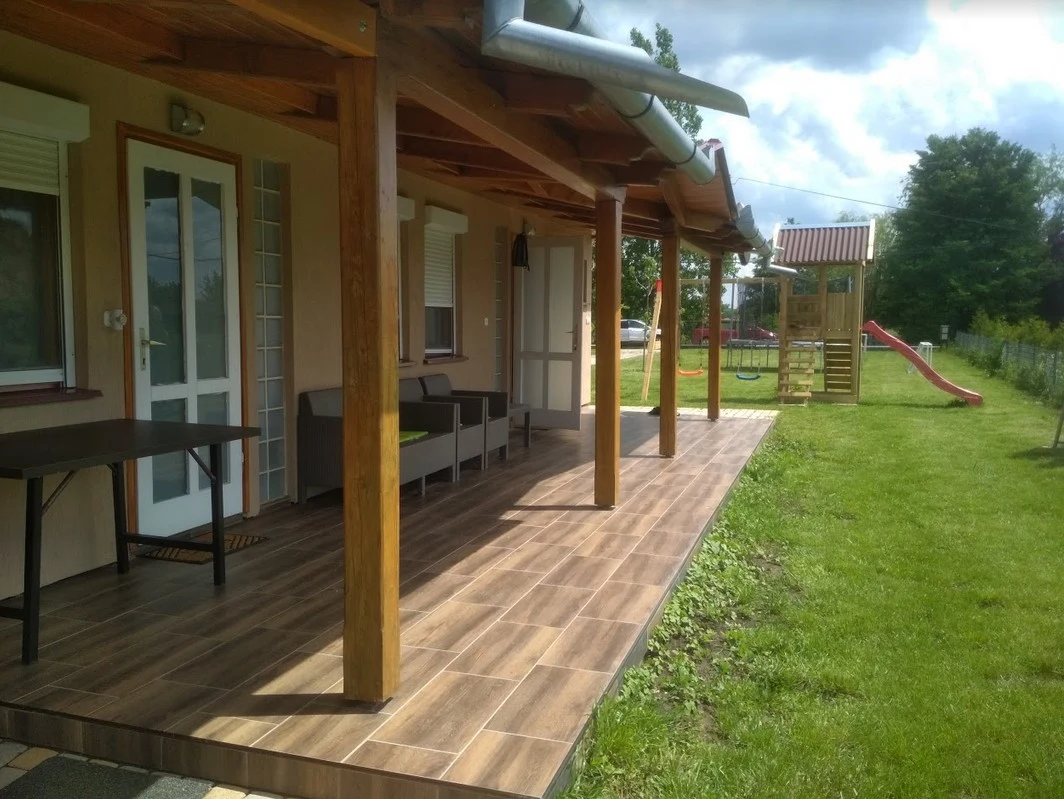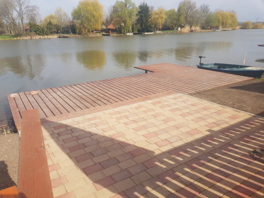 A négy oldalról elkerített kertet kényelmes kerti bútorok, napozóágyak, egy hangulatos filagória, kinti hűtő, palackos gáztúzhely, grillkocsi és szalonnasütő hely teszik meghitté, melyhez nyársakat és a szükséges tűzifát biztosítjuk. A szórakozást a pingpongasztal, darts és futballkapu garantálják, míg a kertben a kisebbeket trambulin és mászókával, dupla hintával, csúszdával és homokozóval felszerelt játszótér várja. Emellett egy 1 fekvő és 4 ülőhelyes kanadai fa borítású jacuzzi, valamint egy félsüllyesztett 7,2 m x 3,5 m x 1,3 méteres, fűthető medence is a nyaraló szolgáltatásainak körét bővíti (a medence fűtése május 1. – szeptember 30. között, időjárás függvényében érhető el). A 15 méter hosszú vízparthoz egy 28 négyzetméteres stég és csónak is tartozik. Igény esetén – napijegy kiváltása mellett – helyről etetés 1.500 Ft-os felár ellenében megoldható, illetve amennyiben szükséges, a napijegy beszerzését is vállaljuk (pl. késői érkezés esetén).A gondozott kertben 5 gépkocsi részére zárt parkolás biztosított.
