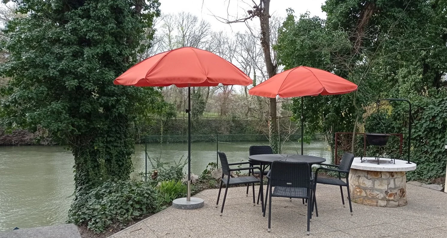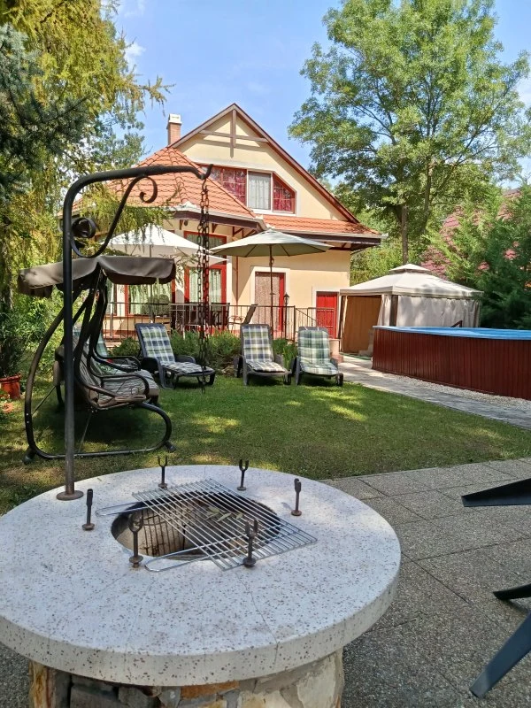 Az épületből kilépve egy hangulatos teraszra érkezünk, ahol gyönyörködhetünk a vízpart szépségében. A terasz mellett kapott helyet egy mobil pavilonnal fedett 7 személyes jacuzzi valamint a 3,5 x 5 méteres medence (nem fűthető). A kertben kültéri kiépített sütögető és bográcsozó is található, melyhez grill, nyárs, tárcsa, bogrács is tartozik, valamint igény szerint, felár ellenében tűzifát és faszenet is biztosítunk. Az udvaron a gyerekek részére egy rönkfából készült hinta és homokozó biztosítja a felhőtlen játék örömét, a pingpong pedig a nagyobbaknak nyújt kikapcsolódást. A 16 méter széles vízparthoz egy 1,5 x 6 méteres stég kapcsolódik, melynek teljes szélességében napozásra, horgászásra nyílik lehetőség. A kikapcsolódáshoz a kert több pontján is elhelyezésre került összesen 6 db napozóágy, 12 db szék, 2 hintaágy, 3 kerti asztal és 4 napernyő is. A kiépített vízparton egy csónak várja az evezésre vágyókat. A négy oldalról zárt udvarban 2, az utcán további 4 gépkocsi részére parkolás biztosított.A nyaralóhoz tartozó 2 db női kerékpár ingyenesen használható.