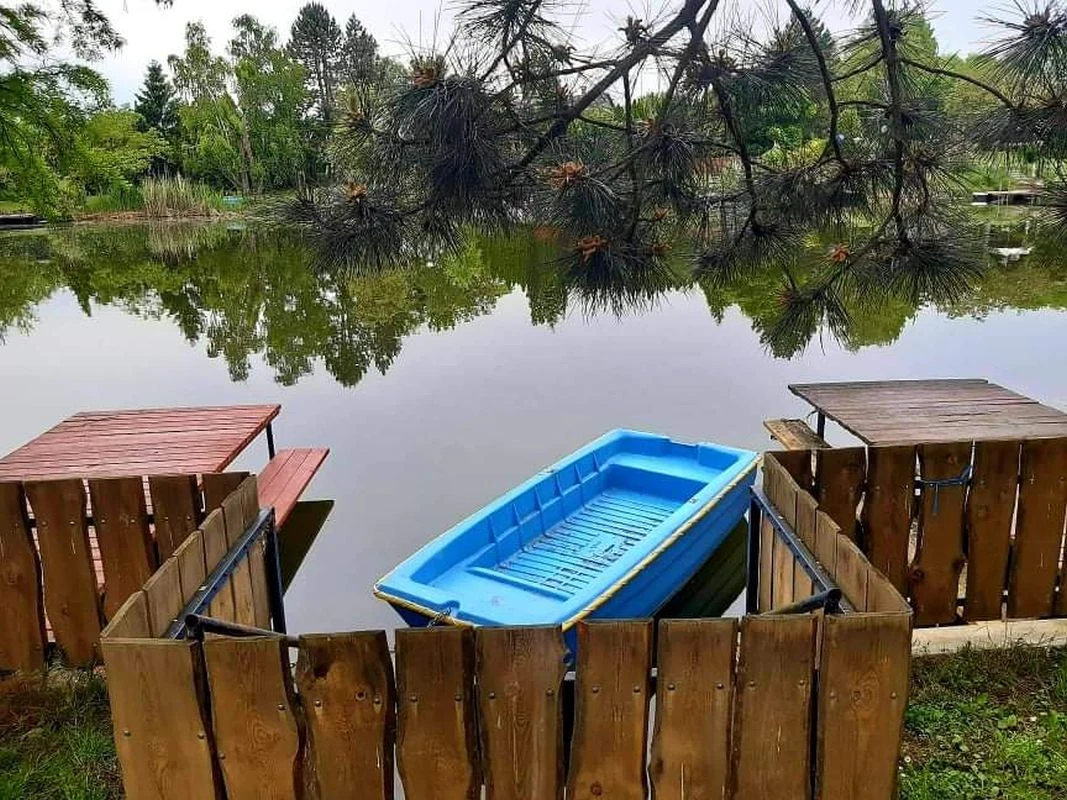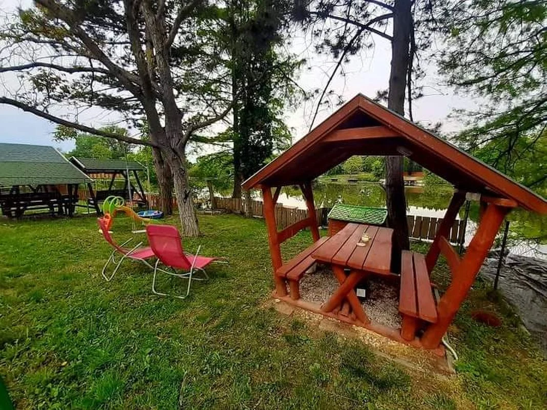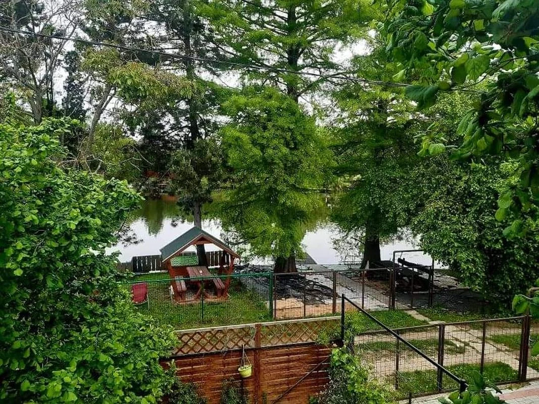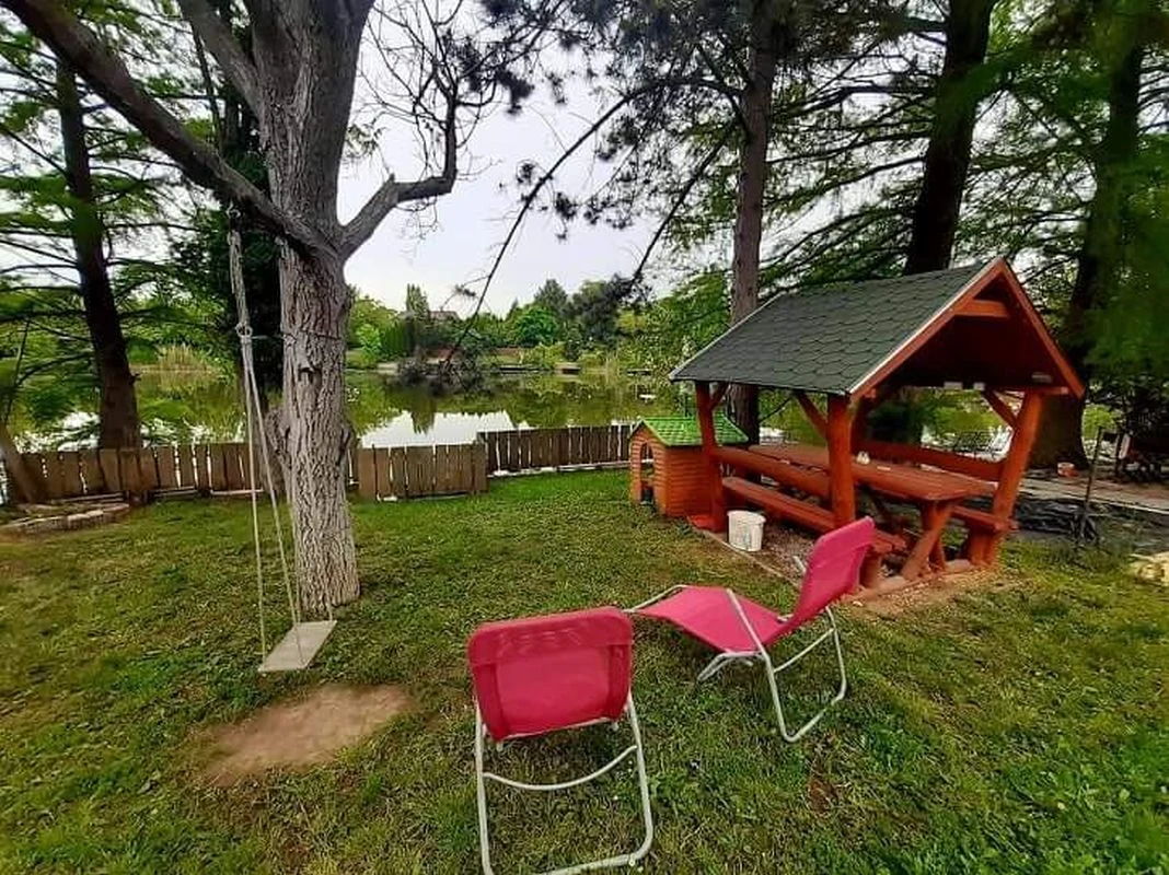 A négy oldalról zárt vendégházhoz saját, külön bejáratú, négy oldalról zárt vízparti telek tartozik, a két telket egy közlekedő út választja ketté.A nappaliból kilépve fedett teraszon keresztül jutunk ki a holtág felőli kertrészbe. A terasz előtti füves területen a szabadban egy 4 személyes jacuzzi nyújt kikapcsolódási lehetőséget. A vízparti telken egy 6 személyes fedett udvari étkező, illetve kiülő található. Az önfeledt napozást, pihenést napozóágyak, függőfotel, függőágy, és kerti székek szolgálják. A kertben szabadtéri bográcsozásra, sütögetésre is lehetőség nyílik, melyhez bogrács, bográcsállvány, mobil grill, nyársak, valamint tűzifa biztosított. A gyermekek kikapcsolódásáról fészekhinta, udvari játékok gondoskodnak. A 12 méter széles vízpart úszásra alkalmas, a csónakkal és vízibiciklivel pedig a holtág jól bebarangolható, emellett kajak és SUP bérlésére is lehetőség nyílik. A két darab 1,5 x 3 méteres stég a horgászoknak sportolási lehetőséget biztosít. A szemközti oldal csendes, csak részben beépített, így az a horgászat szempontjából nagyon kedvező.